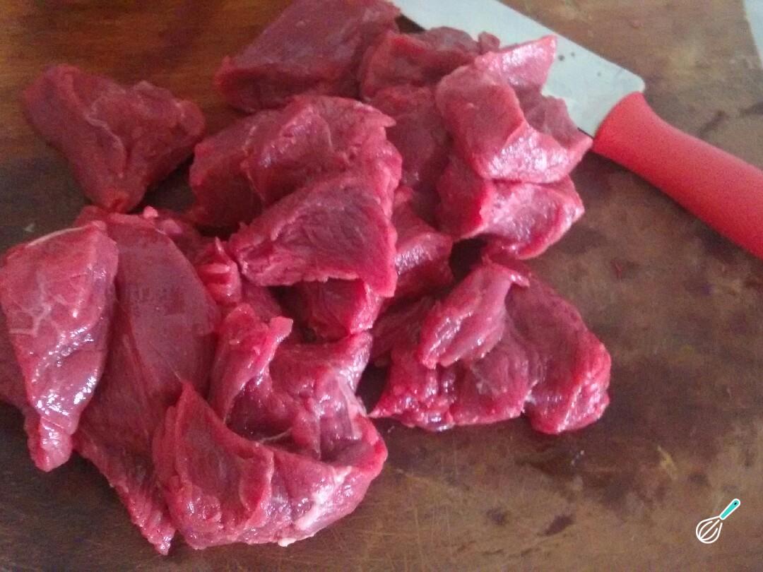 Comece por limpar bem a carne e cortar em pedaços uniformes.