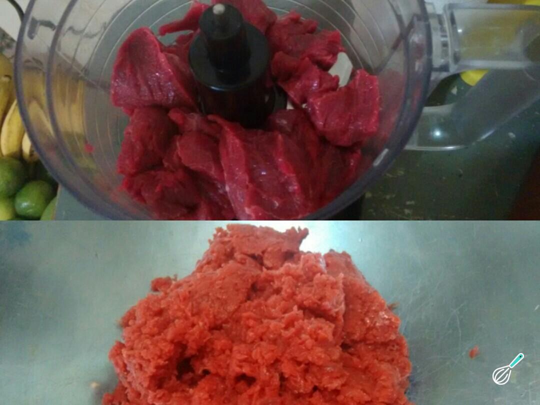 Em seguida processe a carne até ficar bem moída.