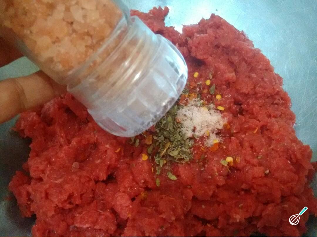 O passo seguinte desta receita de bife de carne moída para hambúrguer é temperar a carne com o sal, orégano e pimenta calabresa. Se você quiser pode acrescentar outros temperos a gosto, como alho moído.