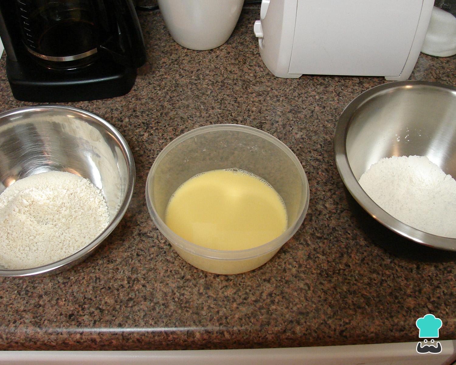 Coloque a farinha de trigo num recipiente, a farinha de rosca noutro recipiente e bata os ovos numa tigela. Empane os bifes de fígado passando cada um deles primeiramente pela farinha de trigo, depois pelos ovos batidos deixando escorrer um pouco. Por último, envolva na farinha de rosca.