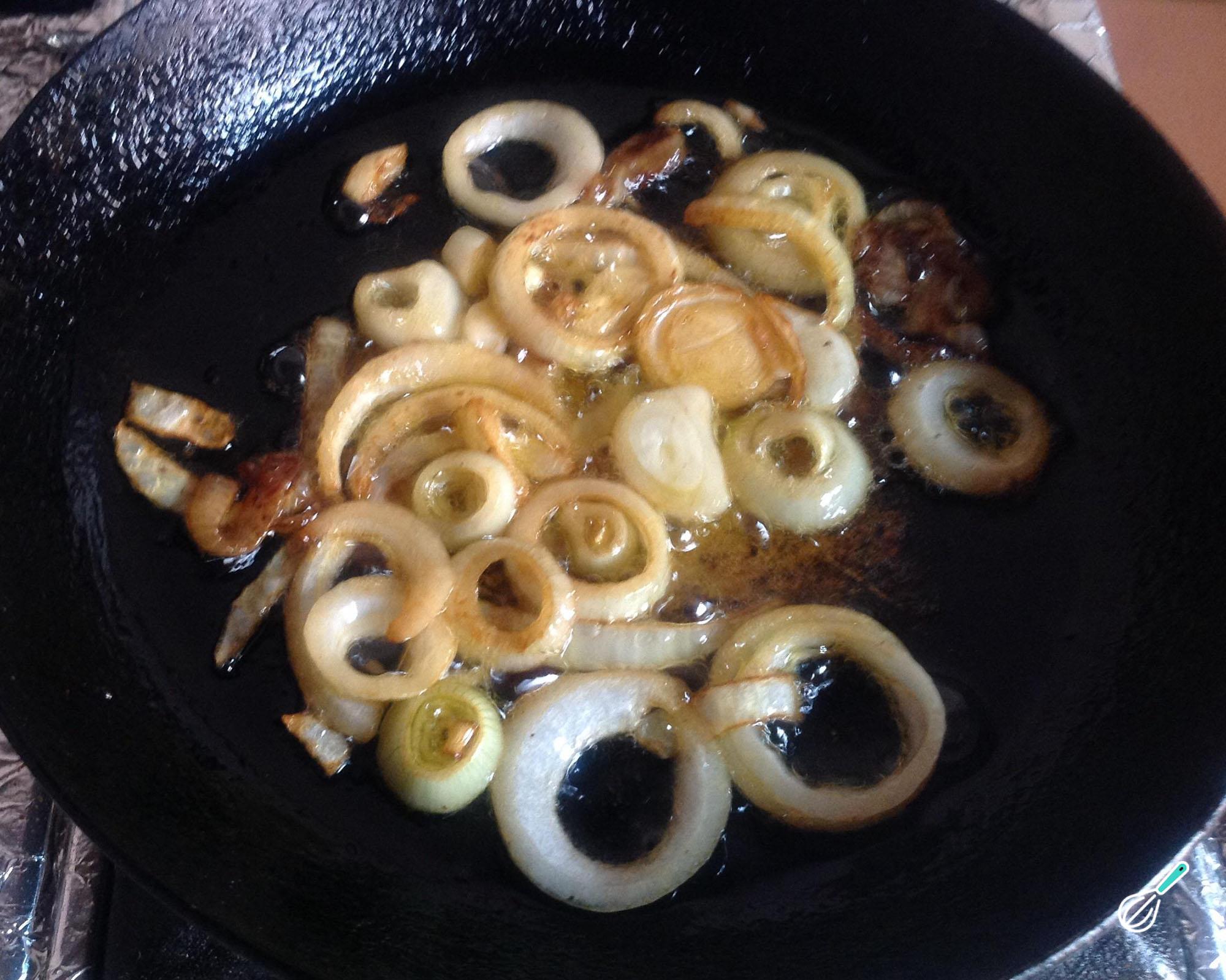 Em seguida descasque as cebolas e corte-as em rodelas. Leve ao fogo médio para baixo uma frigideira com o azeite e a margarina, quando estiver quente, coloque as cebolas. Deixe as cebolas cozinhar até ficarem douradinhas, como na foto.