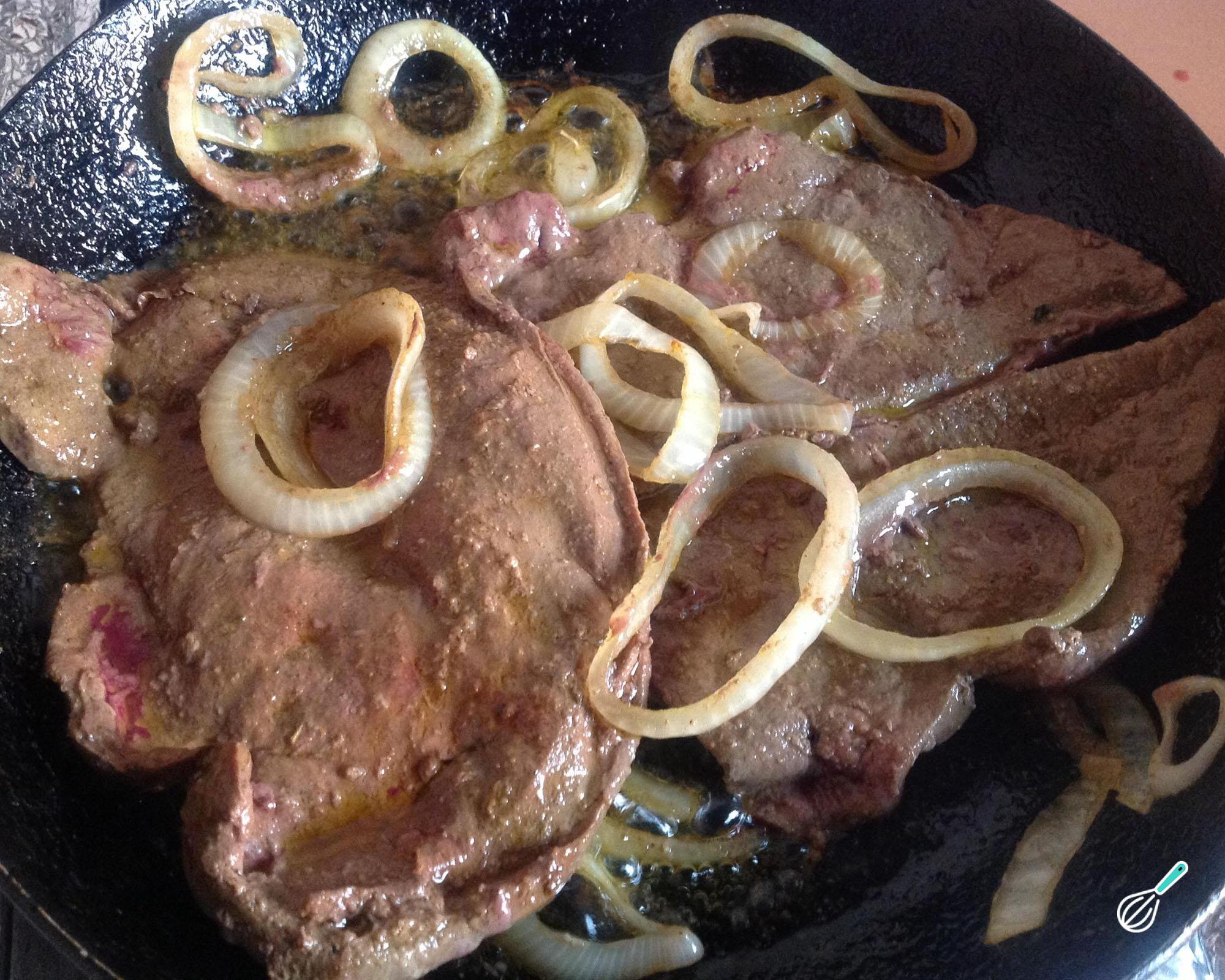 Dica: De vez em quando cubra o fígado com a cebola, para que a carne pegue o gosto dela e para evitar que a cebola queime.