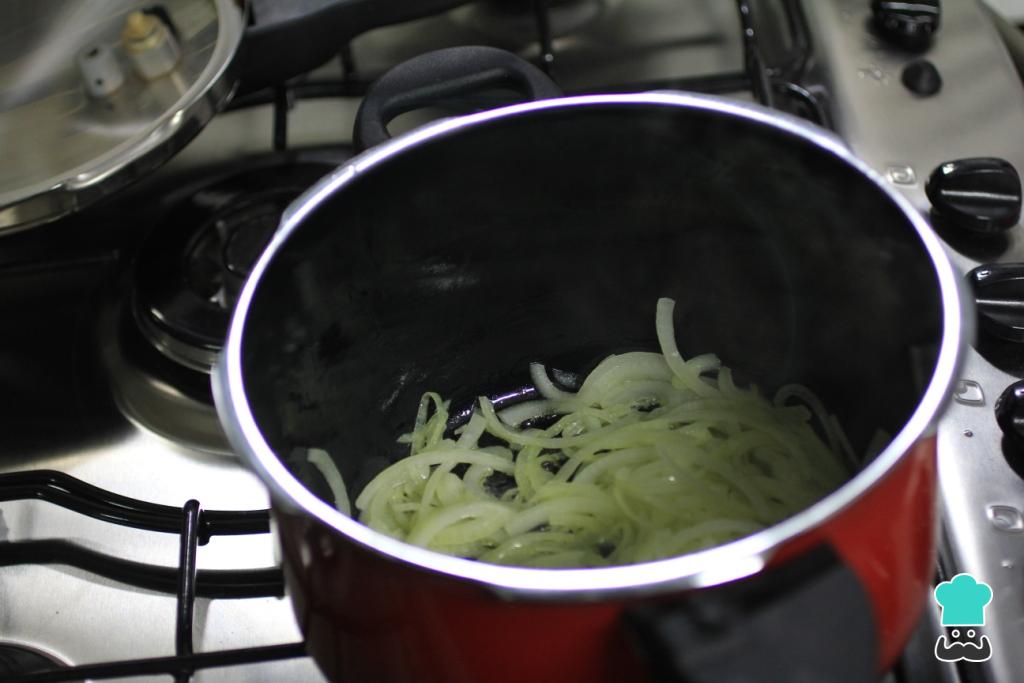 É bem fácil fazer bife acebolado na panela de pressão! Comece por levar a panela ao fogo médio, adicionar o óleo e refogar a cebola cortada em rodelas. Quando estiver transparente adicione os alhos picados e deixe cozinhar por mais 1 minuto, mexendo para não queimar.