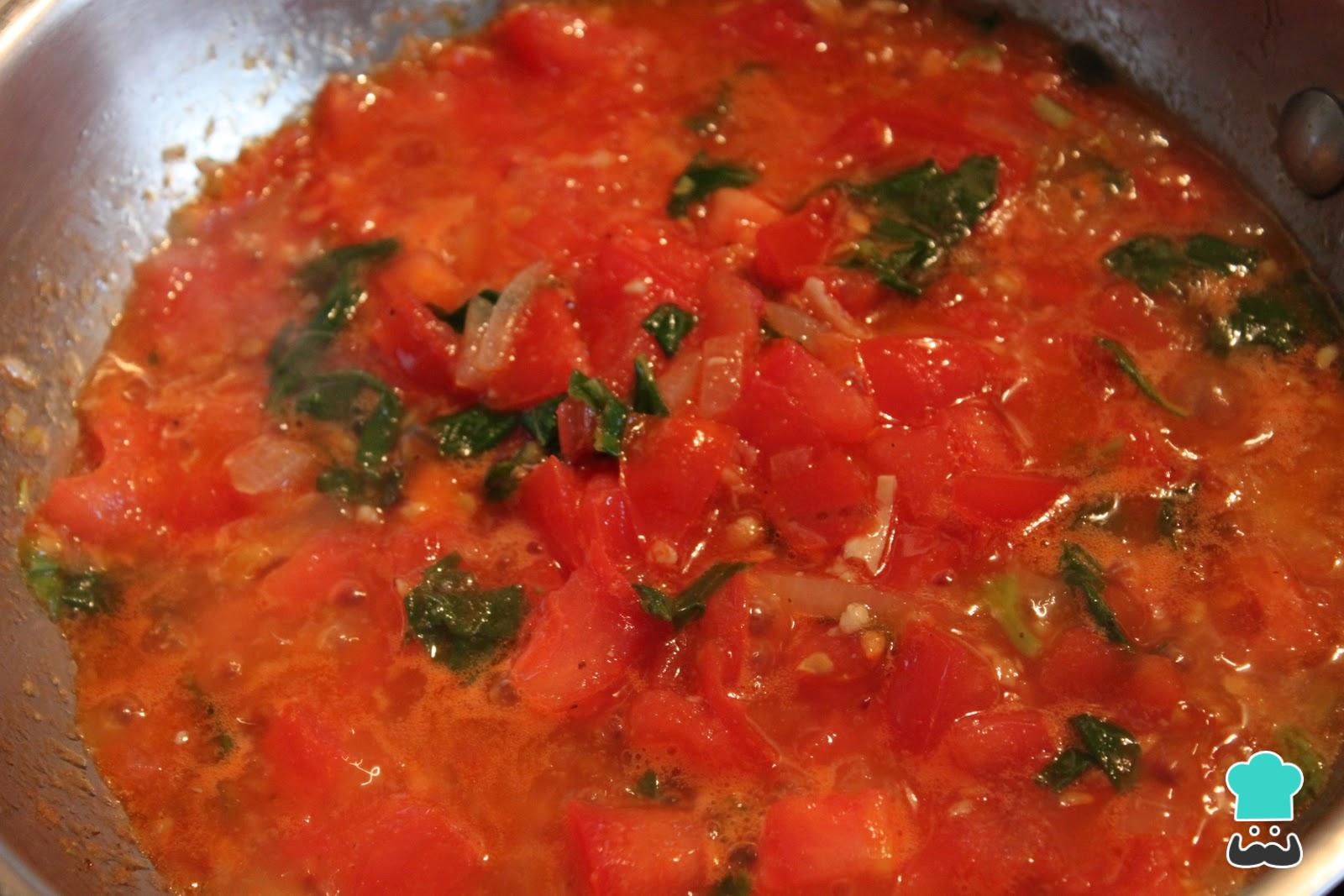Seguidamente adicione os tomates pelados e cortados em pedaços, junto com seu suco. Misture com a cebola e deixe cozinhar por 2-3 minutos, para apurar o sabor.