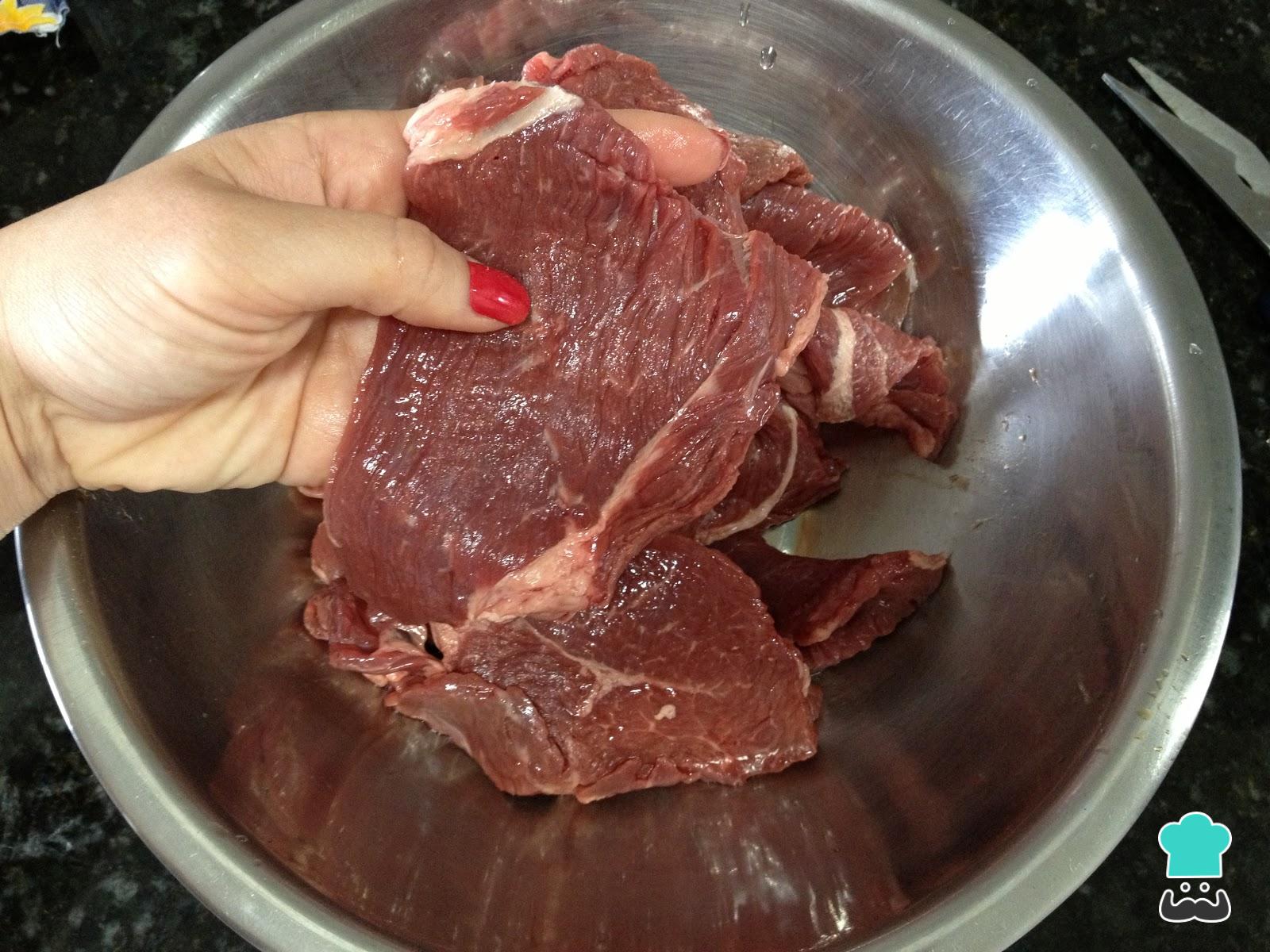 À parte tempere os bifes com sal e pimenta a gosto e junte à panela. Acrescente o caldo de carne ou água, o vinagre ou vinho, tampe e deixe cozinhar por 10 minutos depois de chiar.