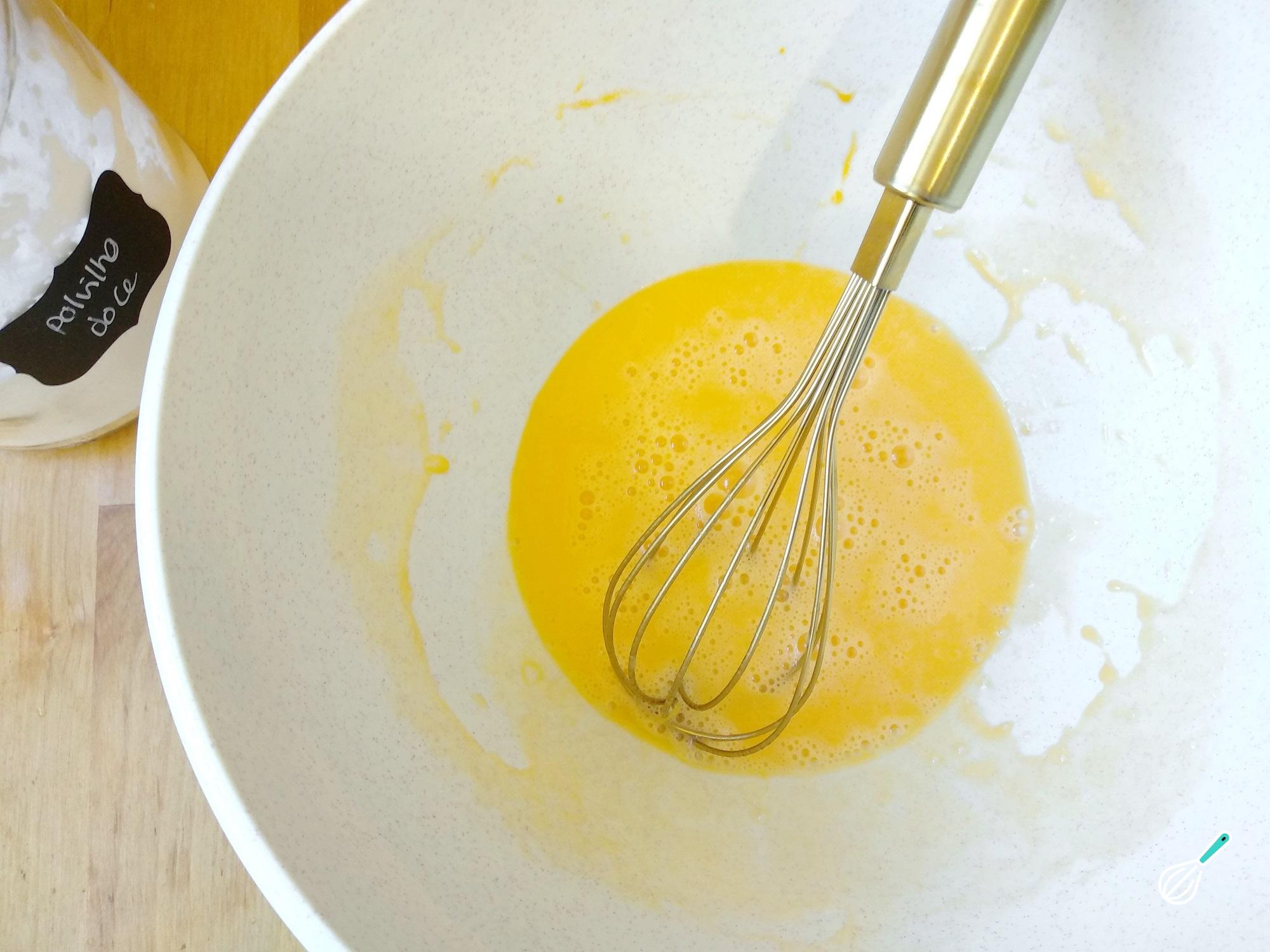 Numa tigela bata, os ovos com um batedor ou garfo, até misturar bem as claras com as gemas. Adicione o óleo, manteiga (em temperatura ambiente) ou use banha - e volte a misturar.