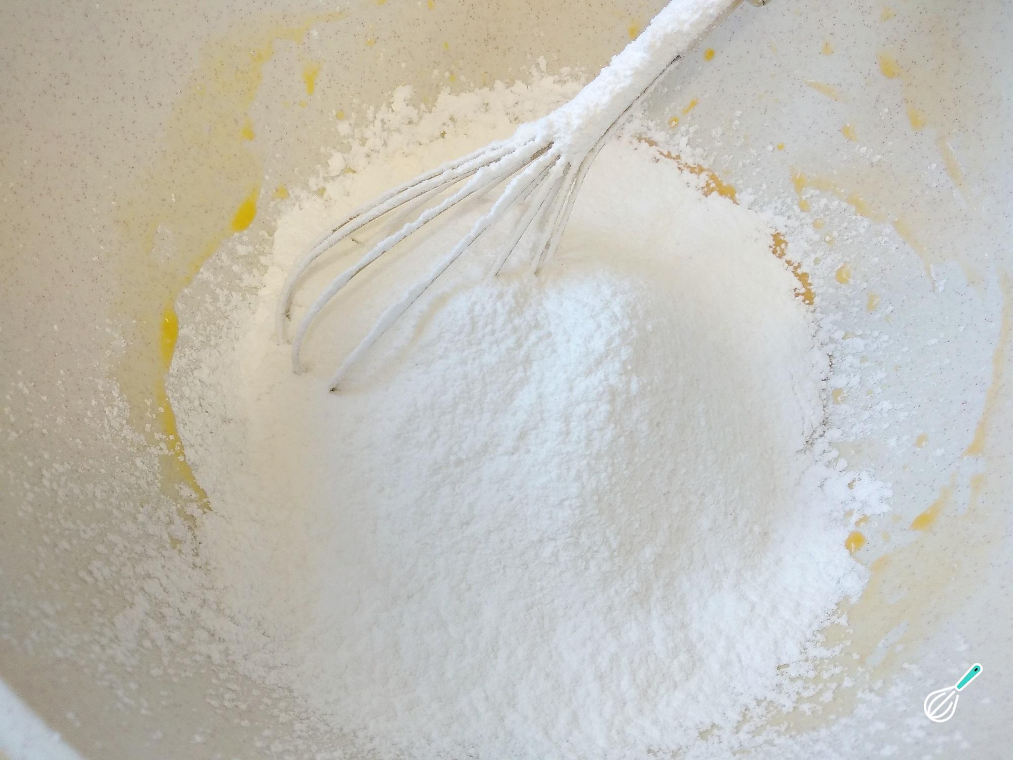 Em seguida acrescente o polvilho peneirado, o sal e o fermento e misture com o fouet ou garfo até a massa ficar durinha.