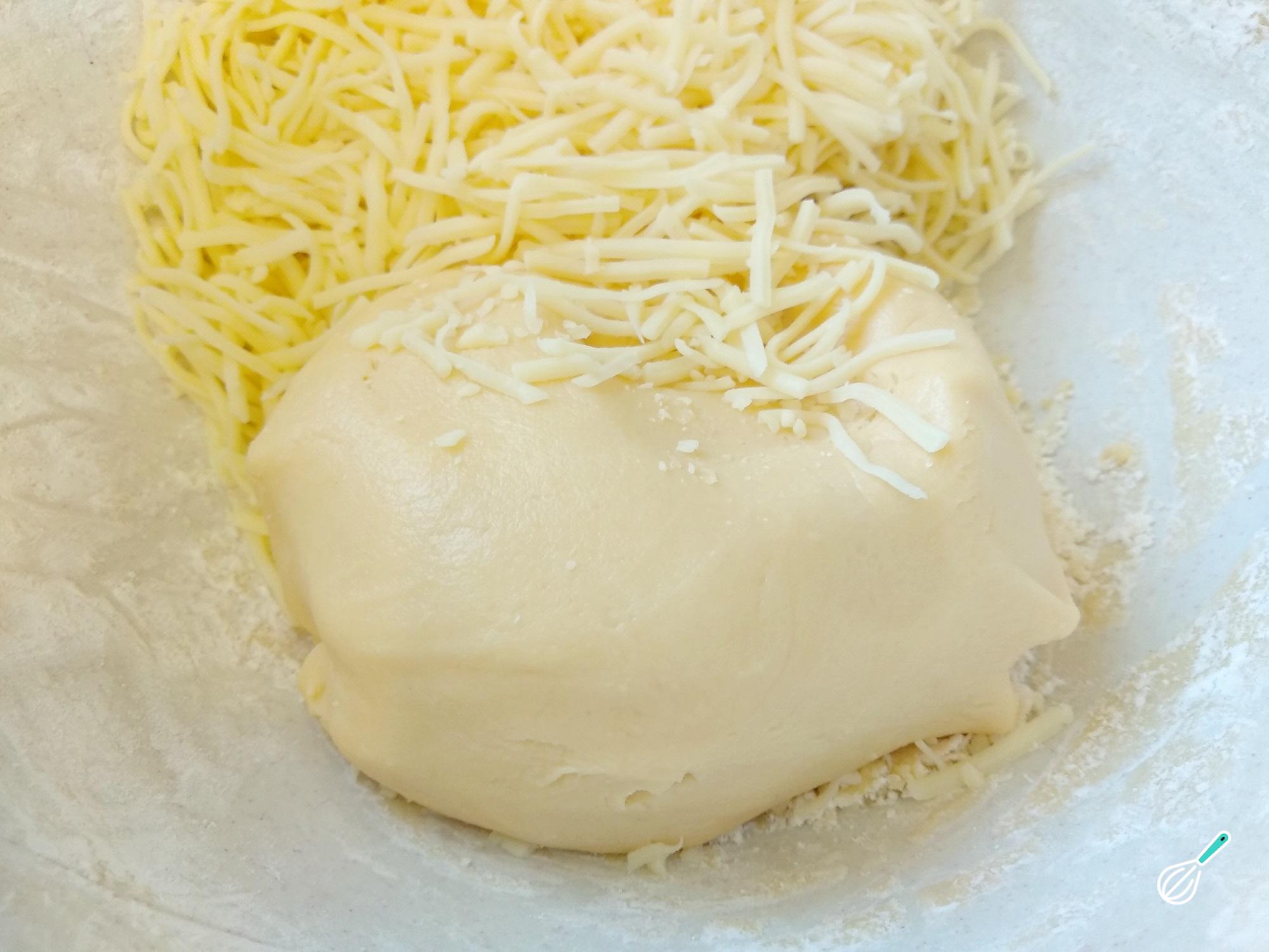 Termine de misturar e amassar com as mãos até obter uma massa bem macia e que gruda levemente. Adicione o queijo ralado e amasse muito bem até incorporar.