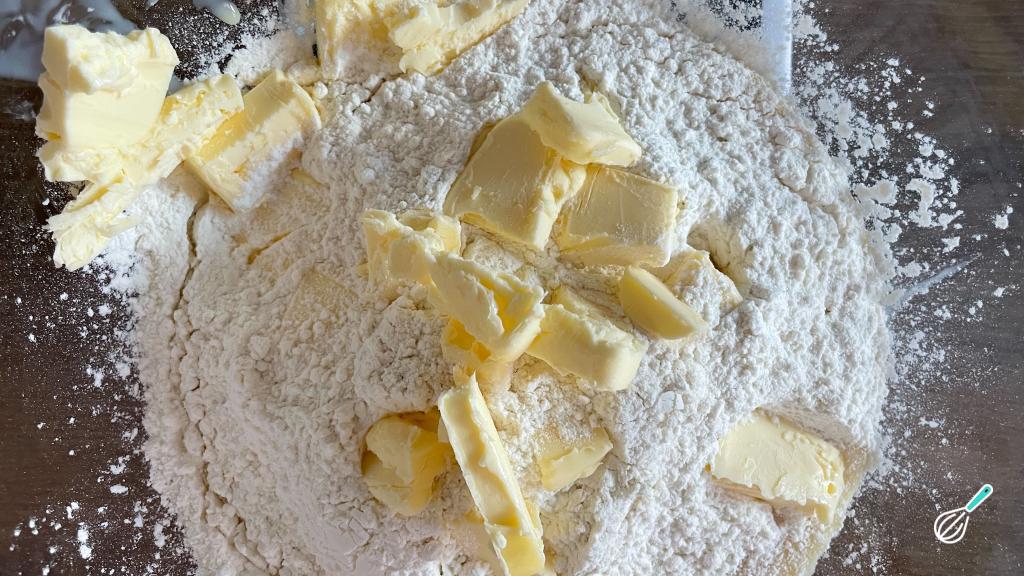 Numa tigela, coloque o leite condensado, a farinha de trigo, a manteiga em cubos e o extrato de baunilha.