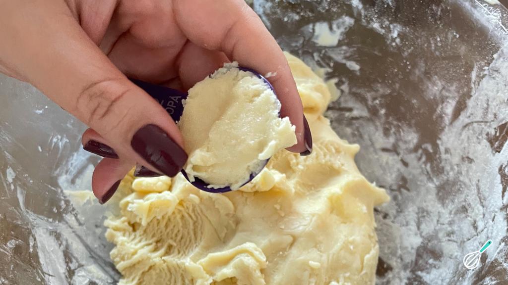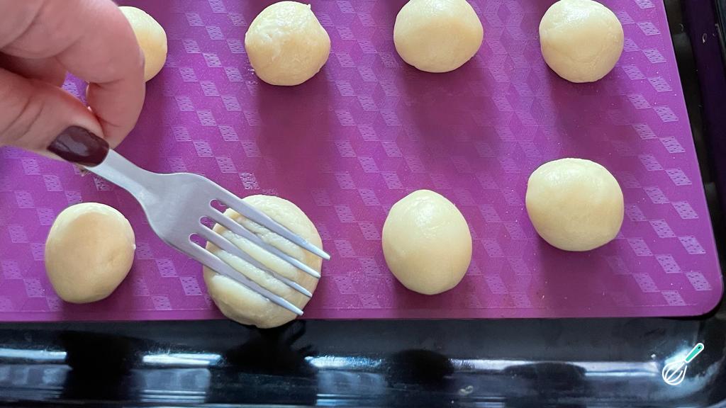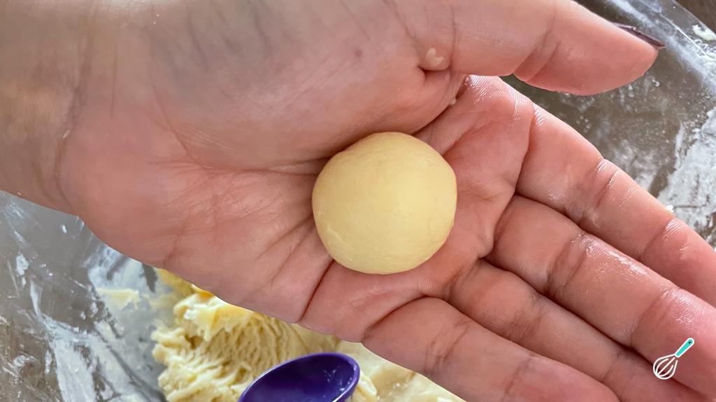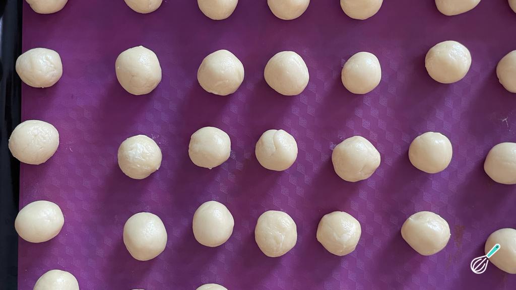 Repita este processo até a massa terminar. Coloque as bolinhas numa assadeira untada ou com um tapete de silicone, deixando um espaço entre elas.