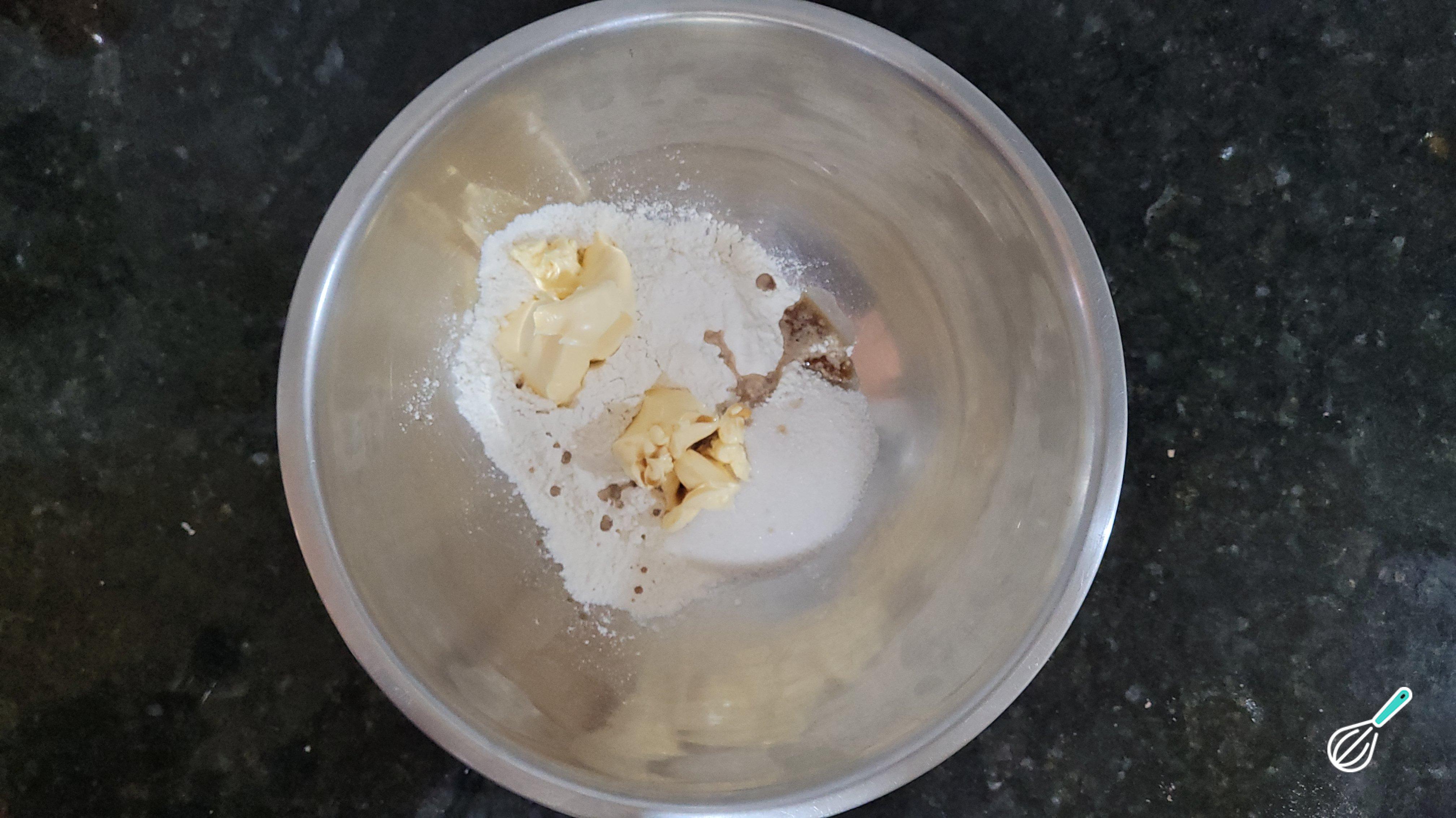 Em um recipiente, coloque a farinha, o açúcar, a manteiga e a essência de baunilha.