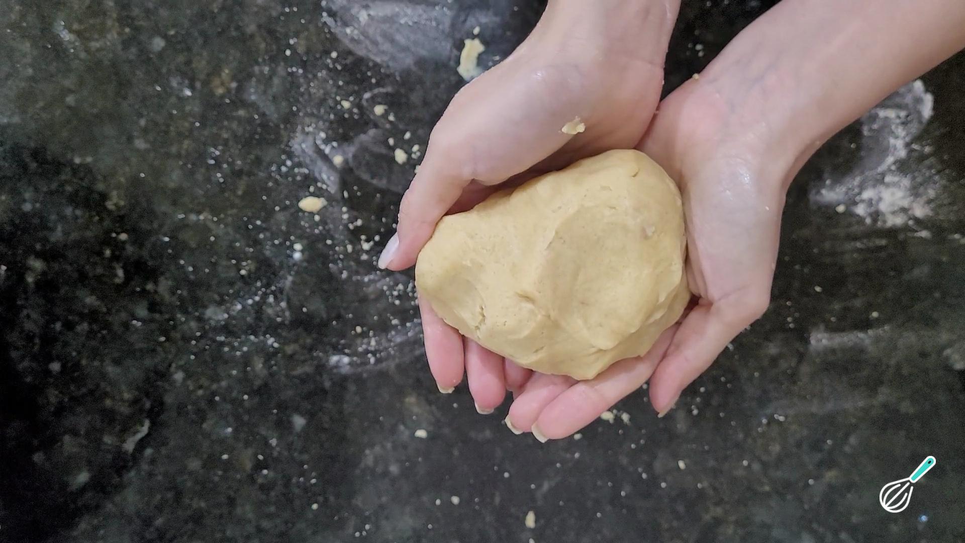 Transfira a mistura para uma bancada com um pouco de farinha e aperte para que fique uma massa homogênea.