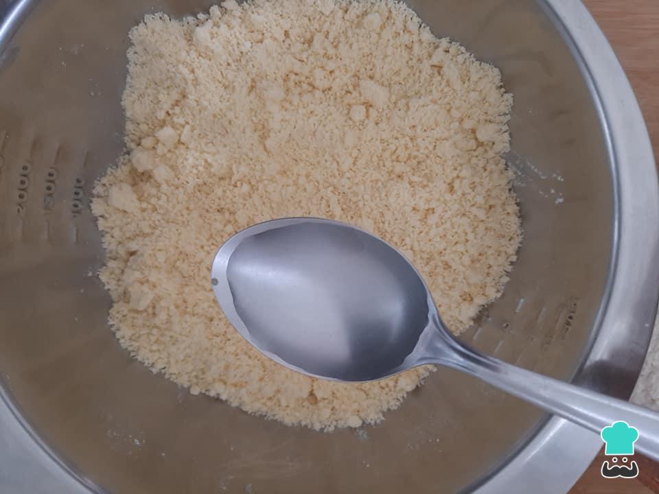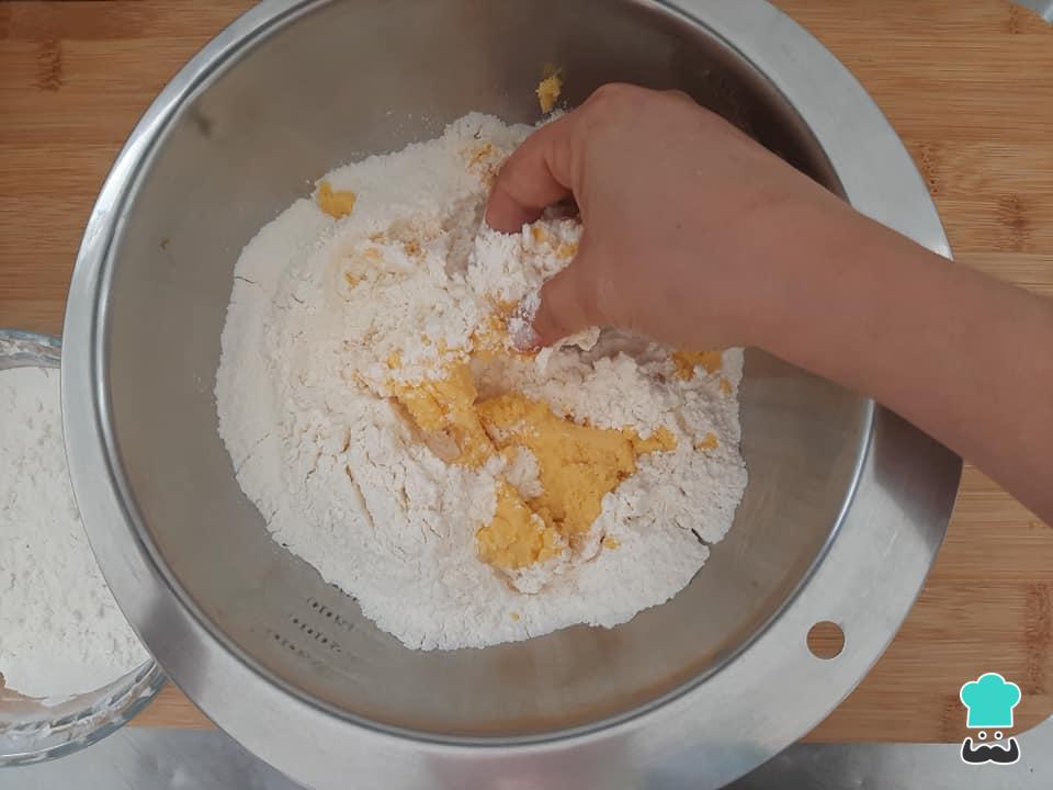 Num bowl junte a farinha de trigo e a manteiga gelada. Com as pontas dos dedos vá misturando os ingredientes até que se forme uma farofinha úmida.