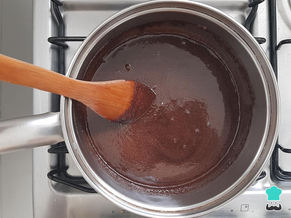 Numa panela pequena junte a água, o açúcar e o chocolate em pó, misturando tudo até ficar homogêneo. Cozinhe em fogo baixo mexendo sempre, por cerca de 5 minutos ou até começar a fervura.