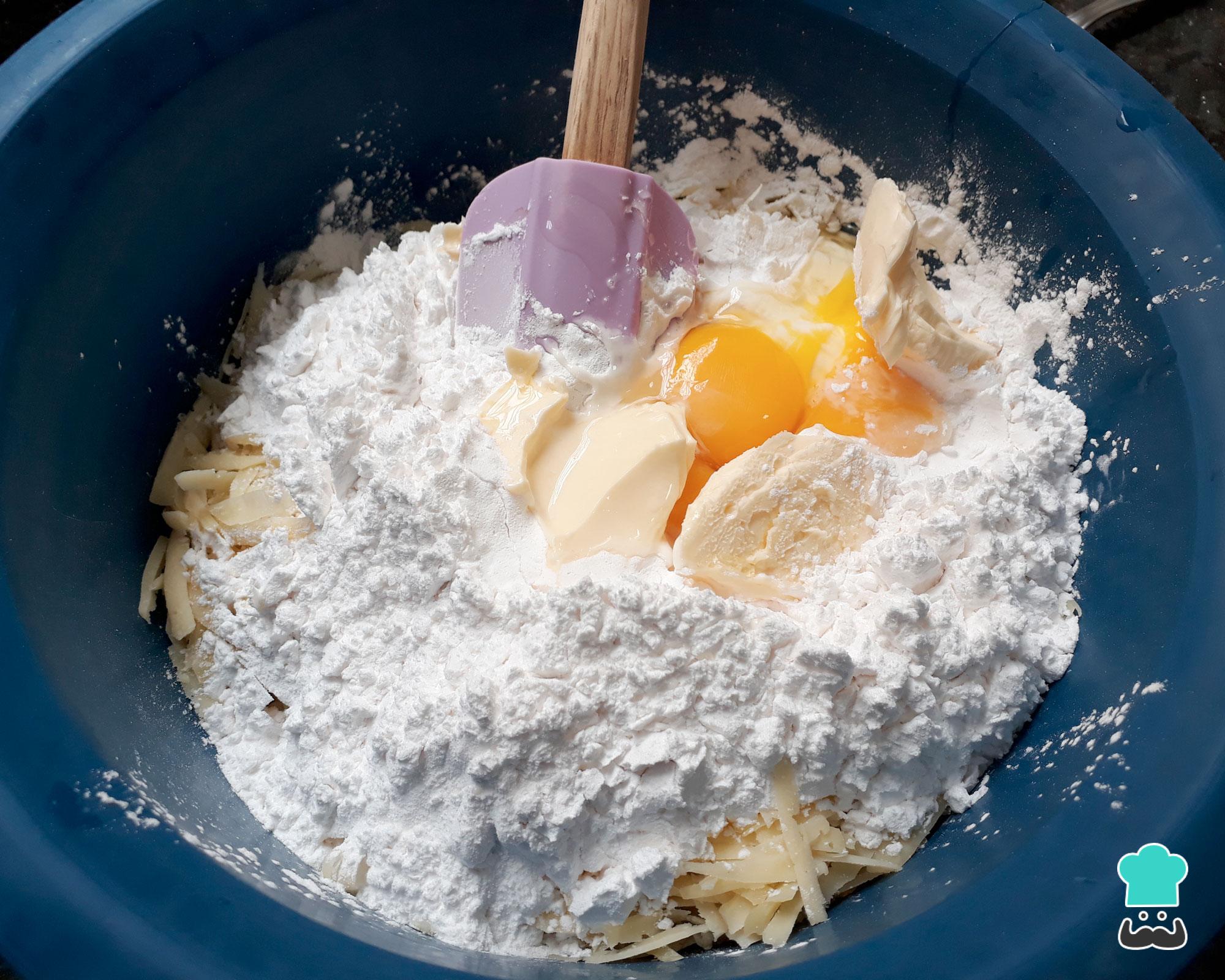 Agora em uma bacia bem grande, acrescente o queijo ralado, o polvilho, os ovos, a margarina e a pitada de sal. Mexa bem bem estes ingredientes da chipa tradicional.