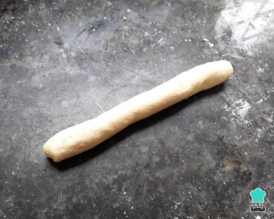 Separe pequenas porções da massa, boleie bem e estique no formato de um canudo, como mostra a imagem.