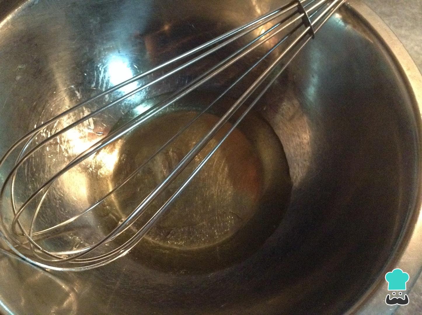 Em seguida separe a clara da gema e coloque em tigelas separadas. Bata a clara de ovo com o açúcar, até virar uma espuma, e adicione a essência de baunilha.