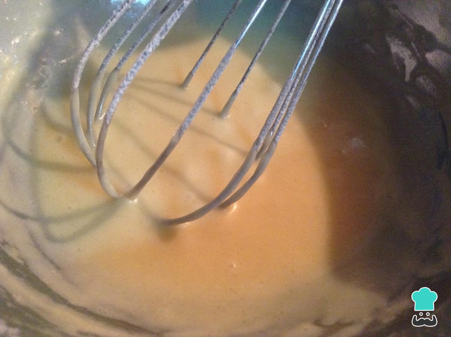 O passo seguinte da receita de biscoito da sorte é adicionar a farinha peneirada e a manteiga derretida. Misture muito bem, até ficar igual à fotografia.