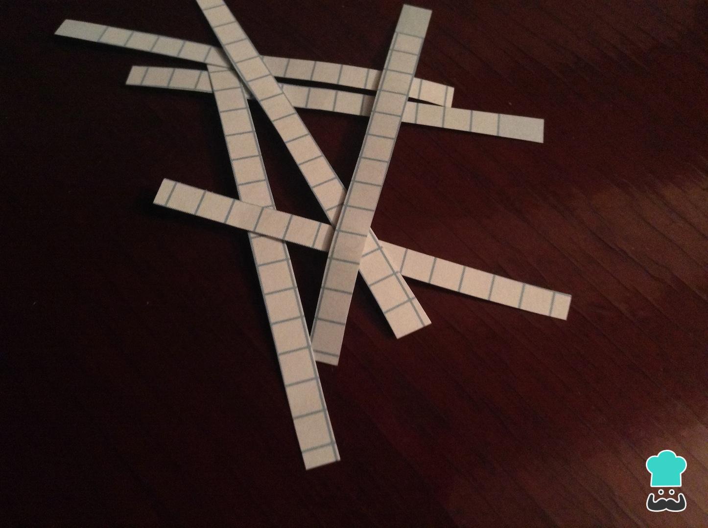 Neste momento pode cortar os bilhetinhos que irá colocar dentro dos biscoitos da sorte. Escreva neles previsões de futuro, piadas ou até algo romântico, se estiver preparando esta receita para o Dia dos Namorados.
