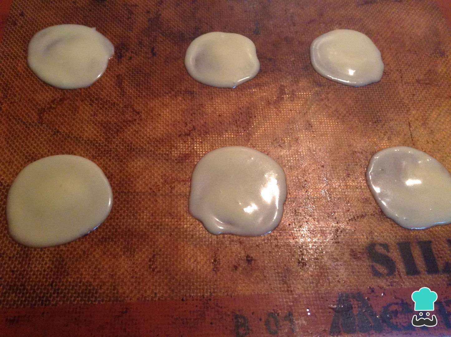Unte um tabuleiro de forno com manteiga, ou coloque nele um tapete de silicone ou papel manteiga. Usando uma colher, distribua um pouco da massa, como se observa na fotografia, e leve ao forno a 180ºC por 5-10 minutos, ou até as beiradas dos biscoitos dourarem.