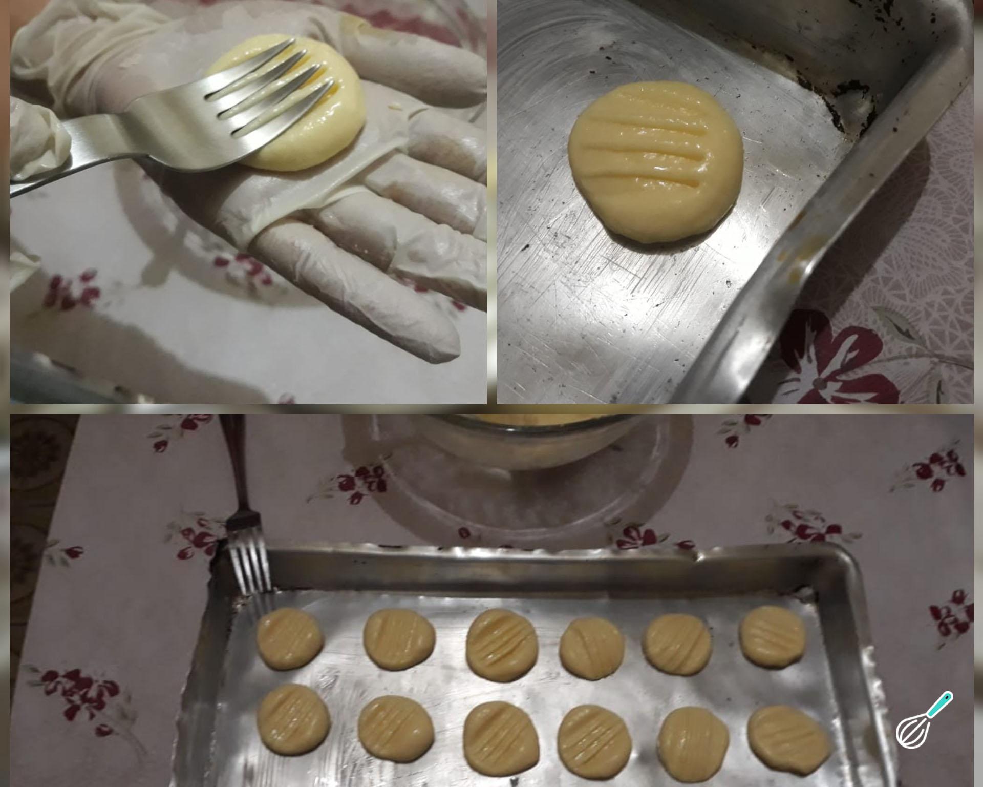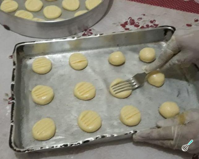 Faça uma bolinha de massa e, com o auxílio de um garfo, aperte a bolinha na palma da mão, formando o biscoito. Coloque-o na forma e repita a operação com toda a massa. Leve os biscoitos de maisena no forno por 15 minutos.