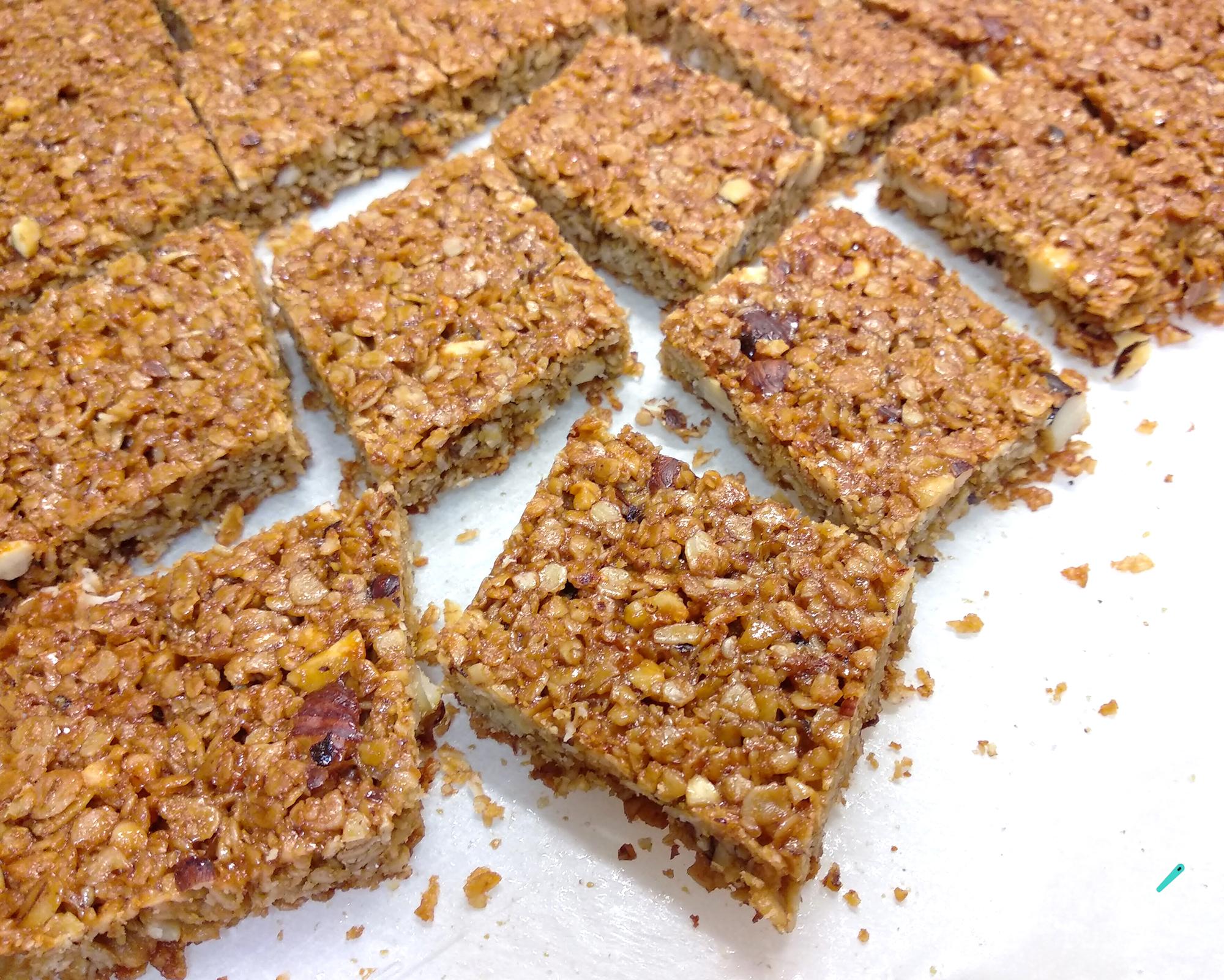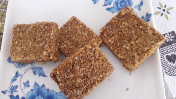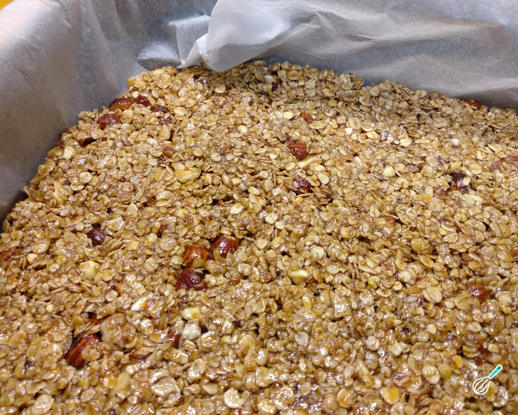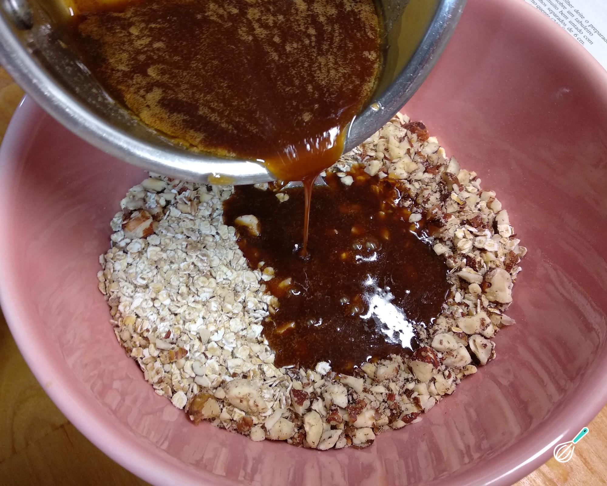 Num bowl coloque a aveia e, se quiser, misture nela a avelã picada. Junte a mistura do passo anterior e mexa muito bem com uma colher até envolver completamente a aveia nesse caramelo. Ligue o forno nos 180ºC.