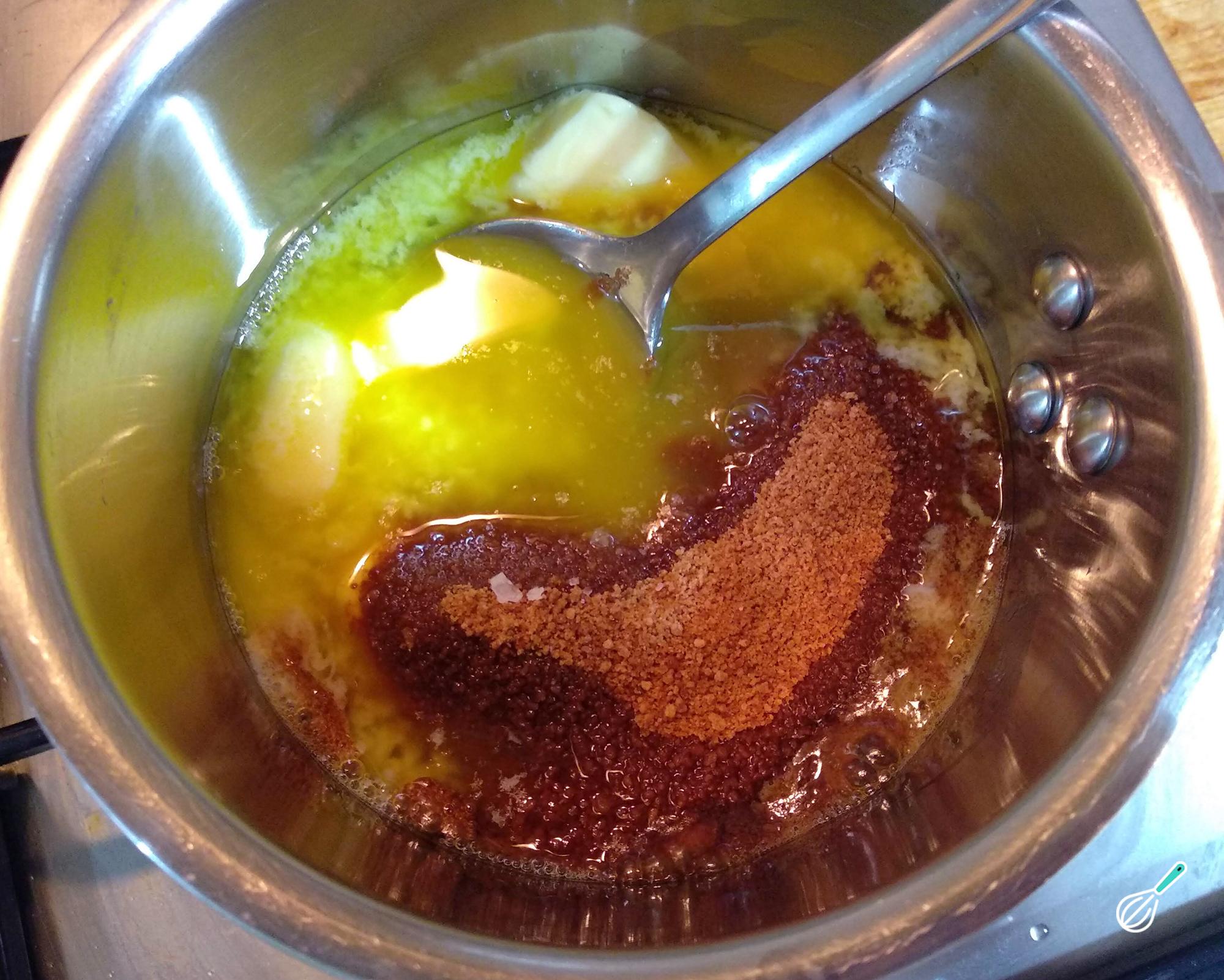 Prepare um caramelo colocando numa panela a manteiga, o açúcar, o mel e o sal. Leve ao fogo médio e fique mexendo até a manteiga derreter completamente. Quando a misturinha começar fervendo desligue o fogo.