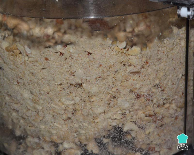Bata a manteiga com o açúcar até obter uma mistura cremosa e com grãos de açúcar dissolvidos. Adicione a castanha picada e misture.