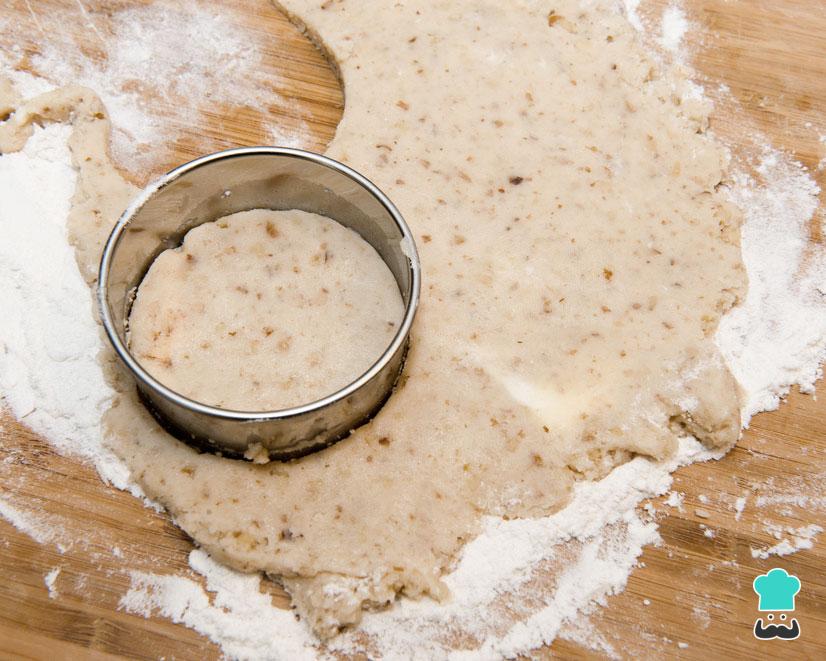 Depois desse tempo polvilhe farinha de trigo na bancada ou numa tábua de cozinha grande e abra a massa do biscoito de castanha com a ajuda do rolo de massa. Depois corte discos usando um cortador de biscoito, um copo ou uma tigela.