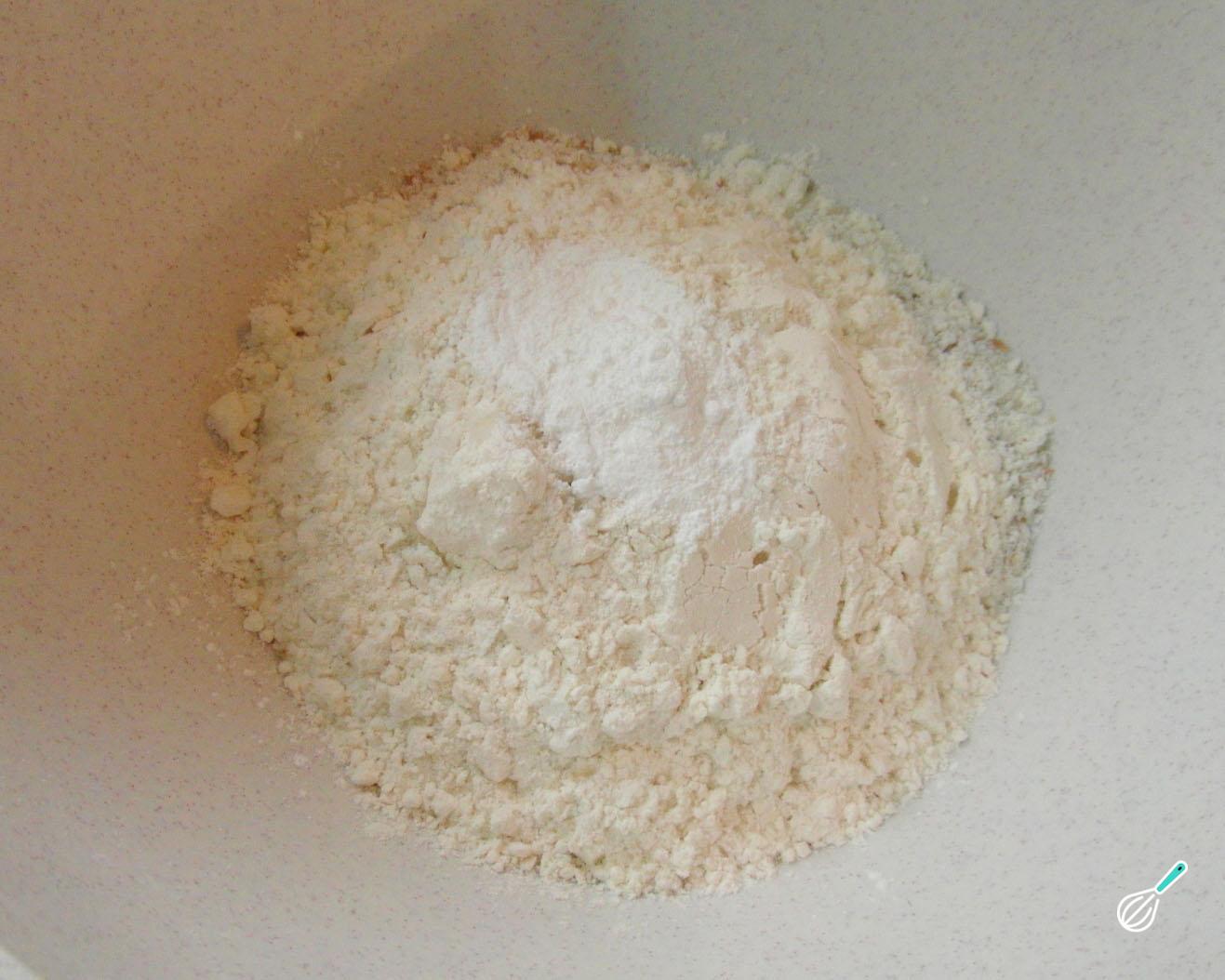 Em um recipiente adicione os ingredientes secos: a farinha de trigo, a farinha de aveia, o adoçante, a maisena, a canela e o bicarbonato.