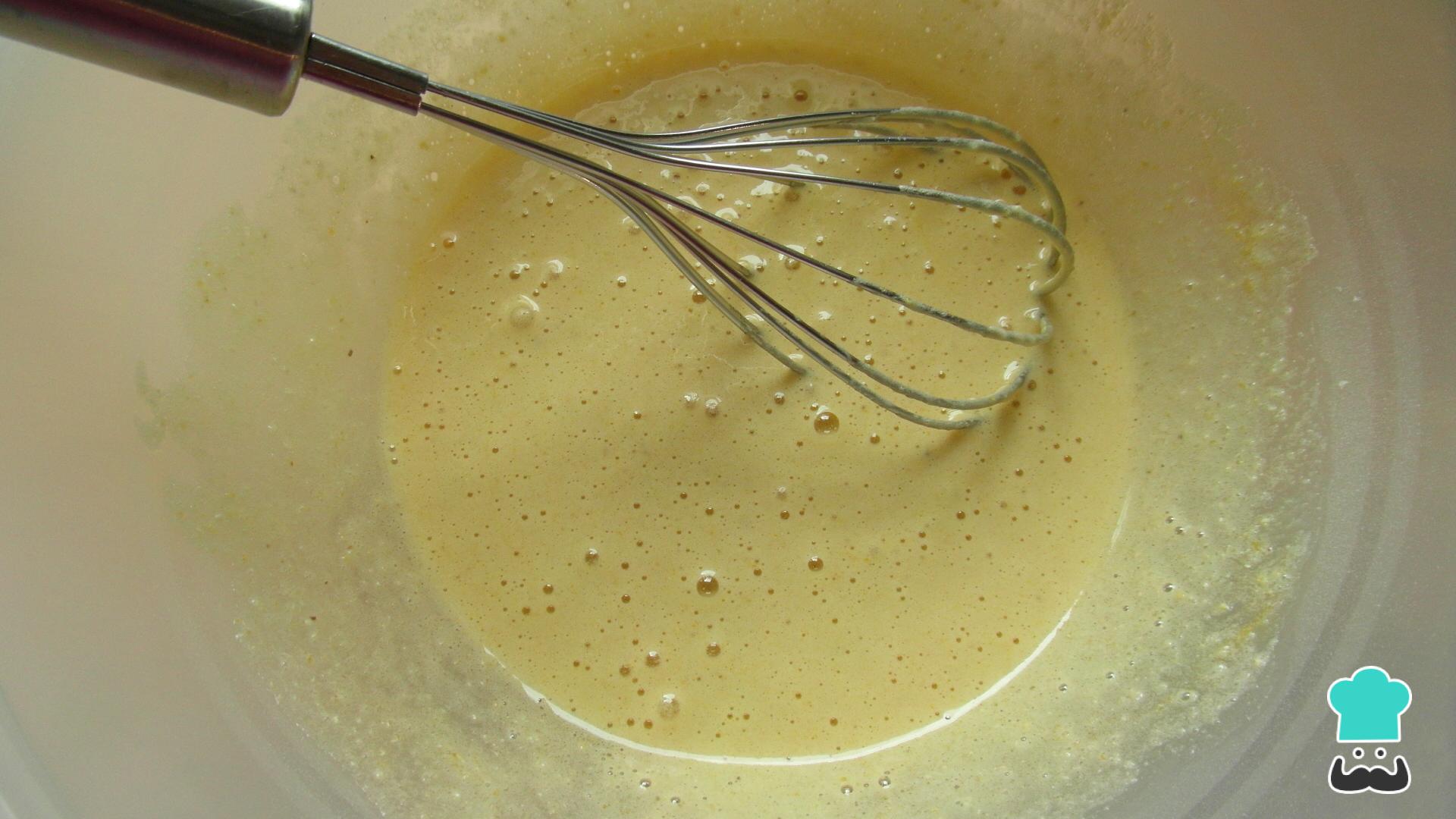Bata os ovos com o açúcar até obter uma mistura espumosa. Acrescente a manteiga e misture novamente.