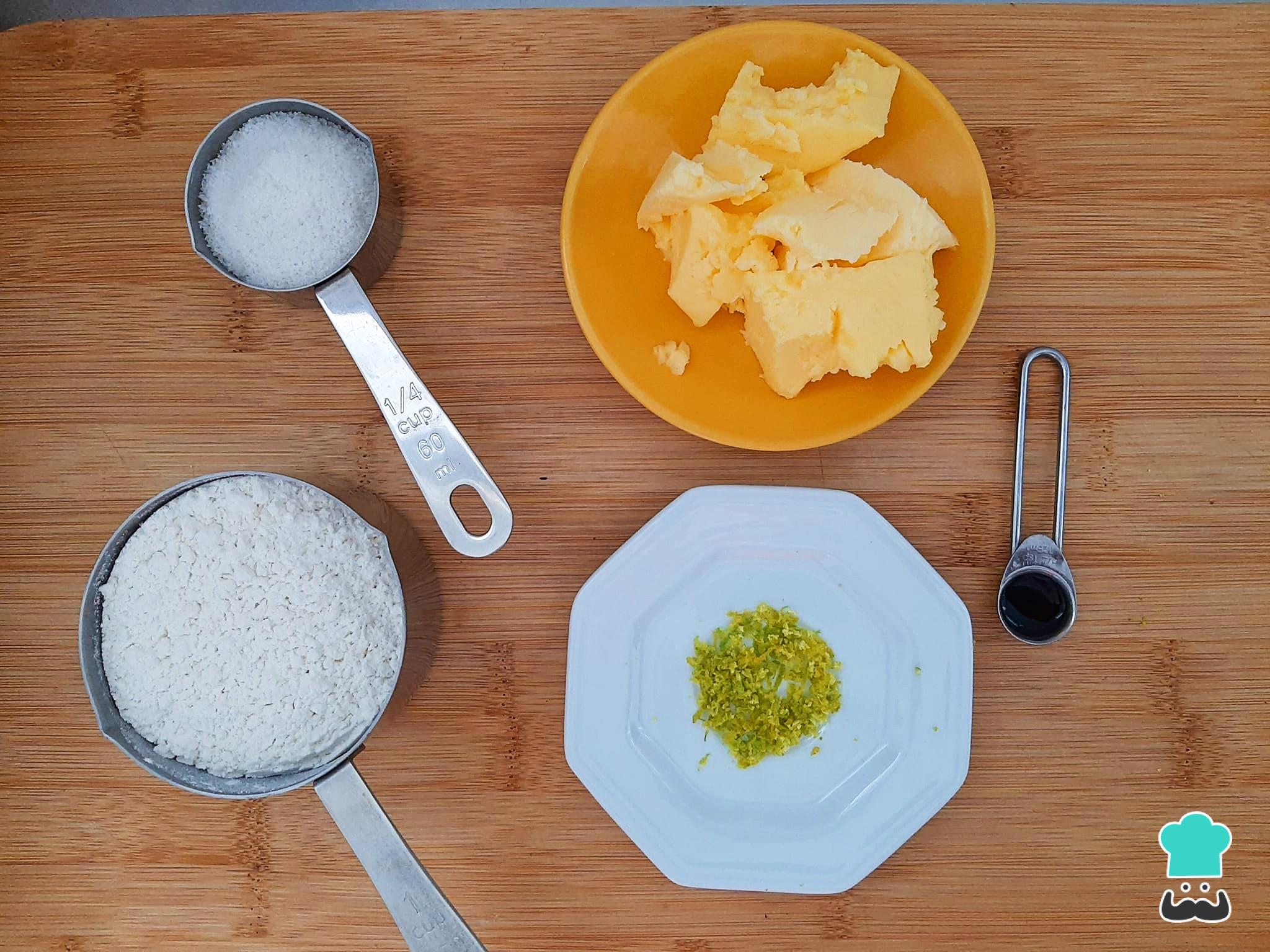 Para essa receita de biscoitos, usaremos farinha de trigo, manteiga, açúcar, essência de baunilha e raspas de casca de laranja, que darão um toque cítrico muito especial aos biscoitinhos!