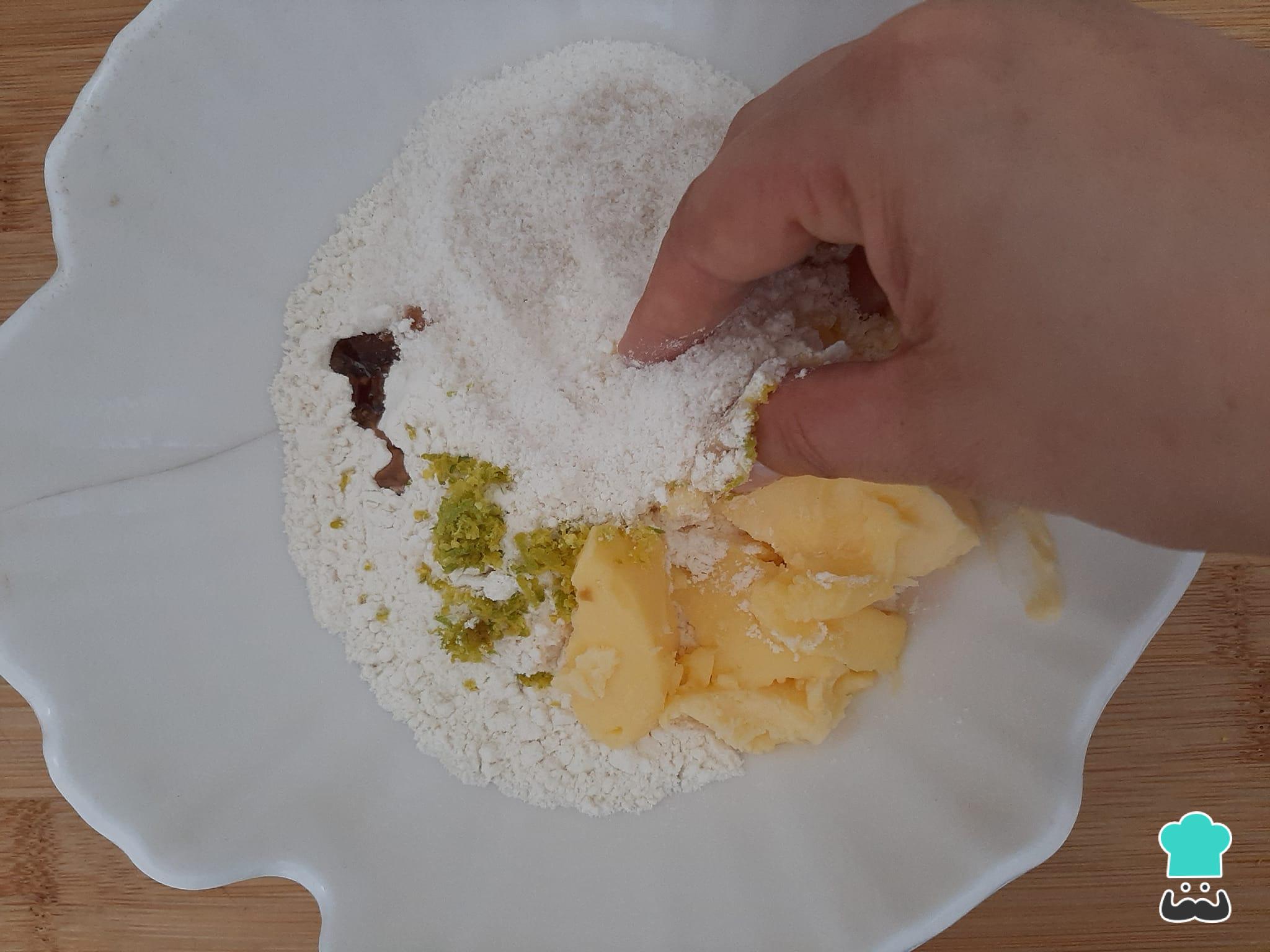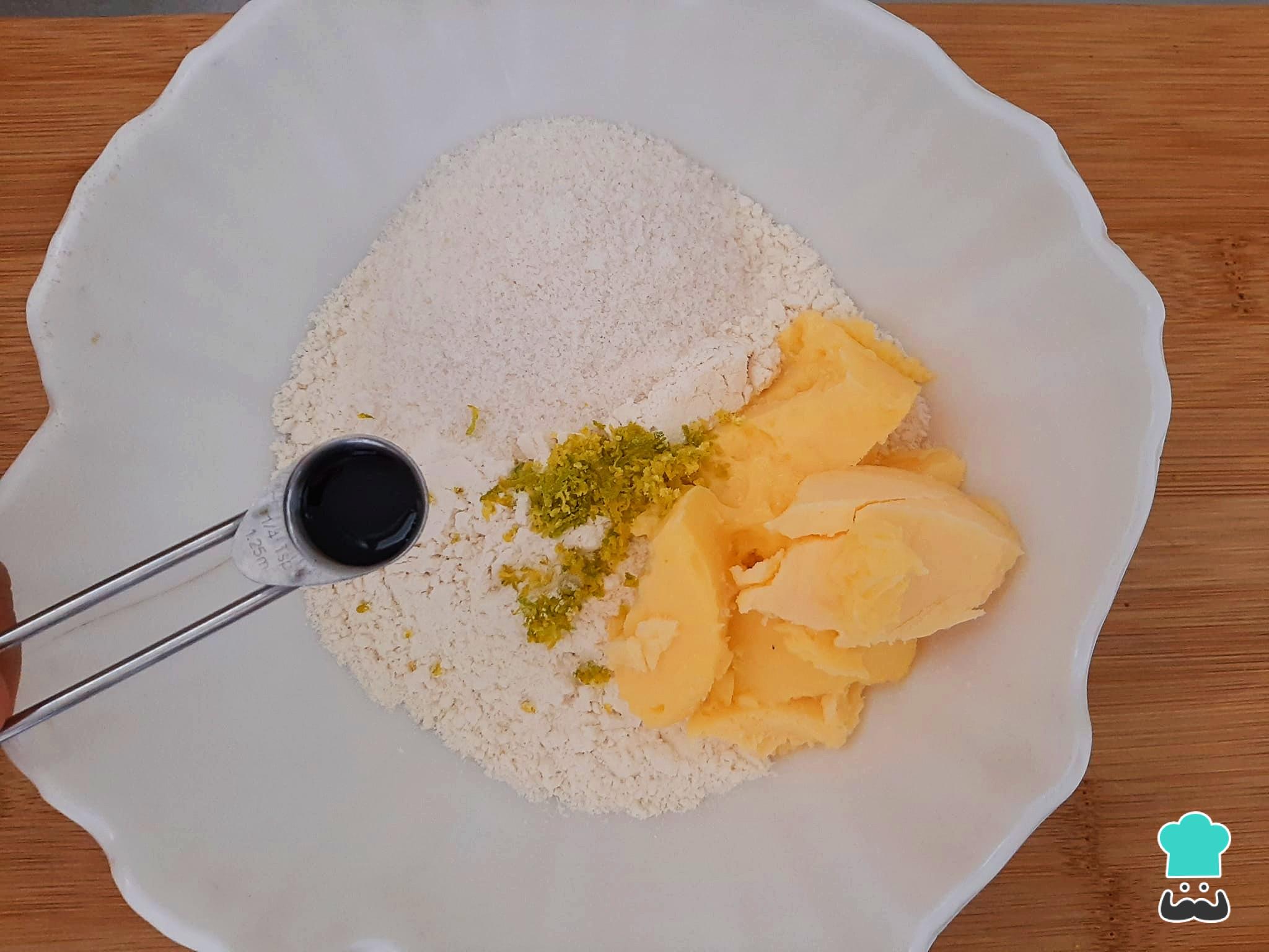 Numa tigela, junte a farinha de trigo com a manteiga gelada, o açúcar, as raspas de casca de laranja e as gotas de essência de baunilha.