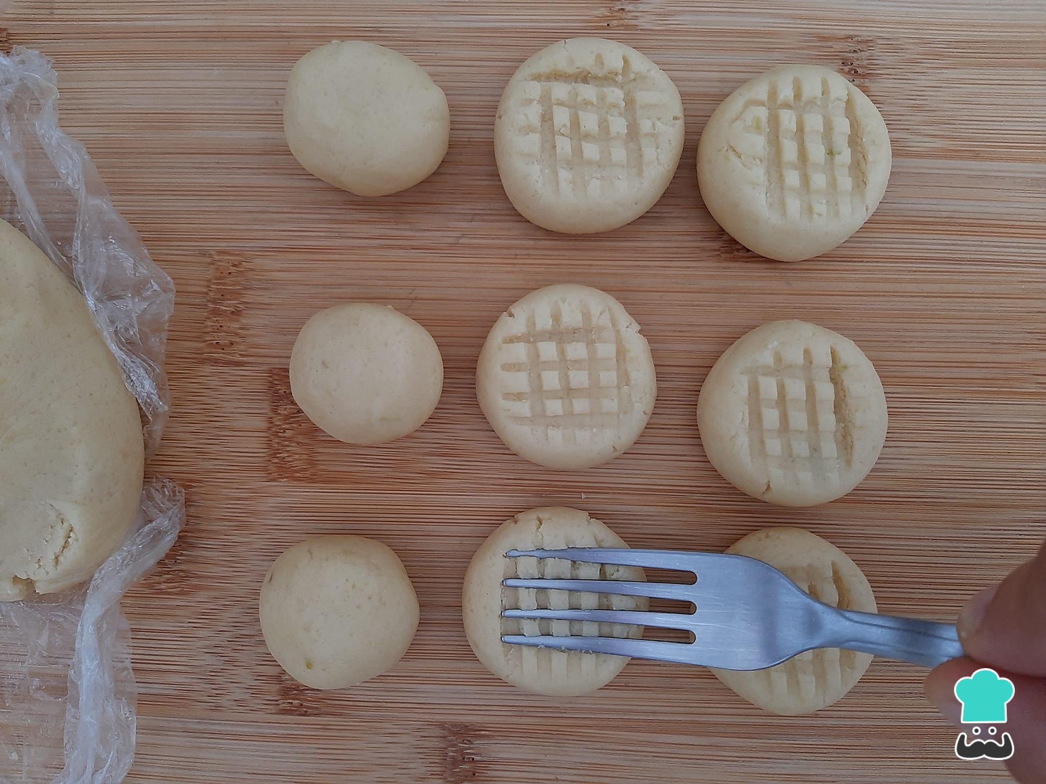 Após esse tempo, modele bolinhas e com auxílio de um garfo, faça marcas nos biscoitos para deixá-los achatados levemente e decorados.