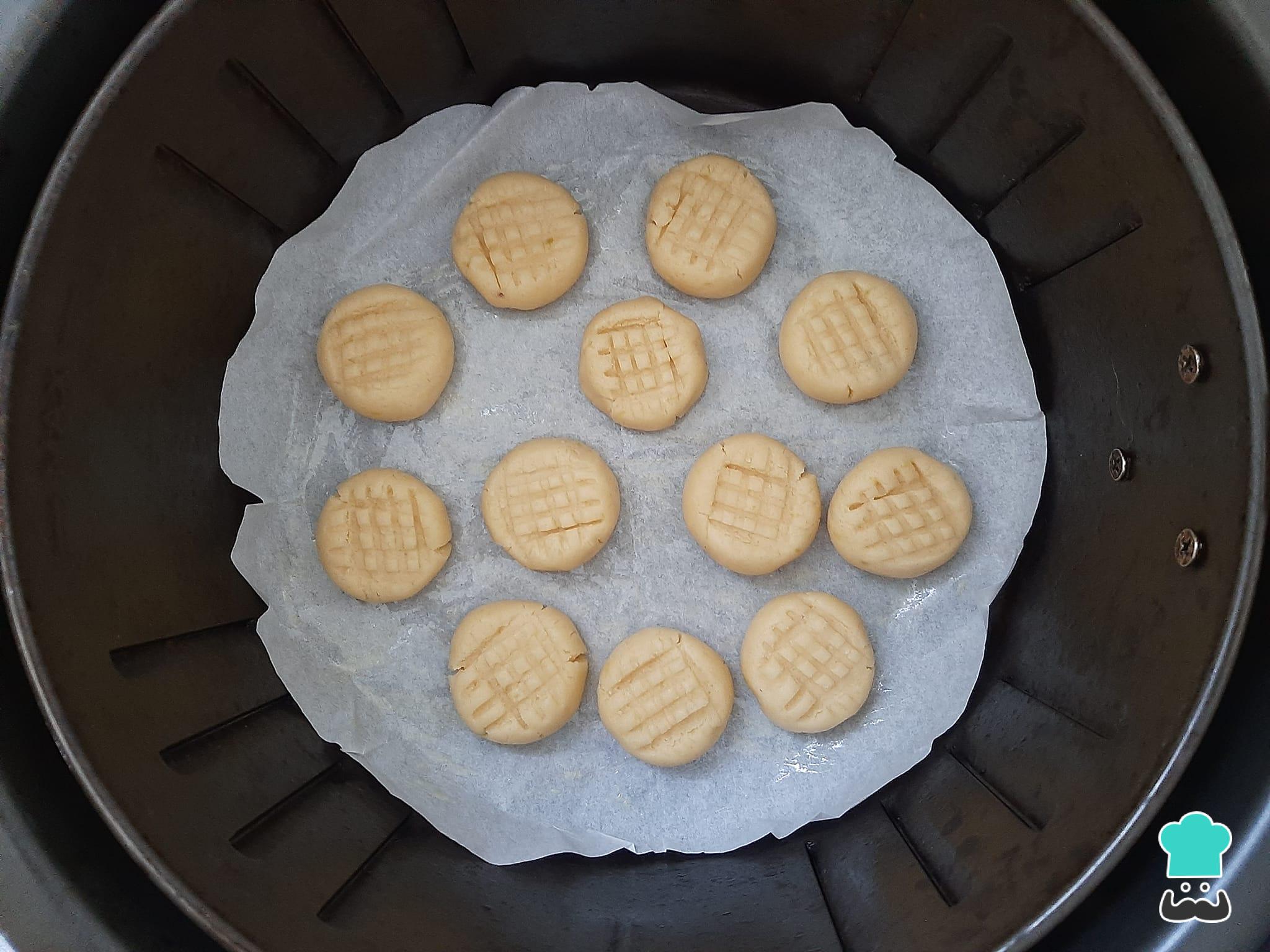 Asse os biscoitos por cerca de 12 a 15 minutos a 180 graus na airfryer, ou até que estejam levemente dourados como mostra a foto abaixo.