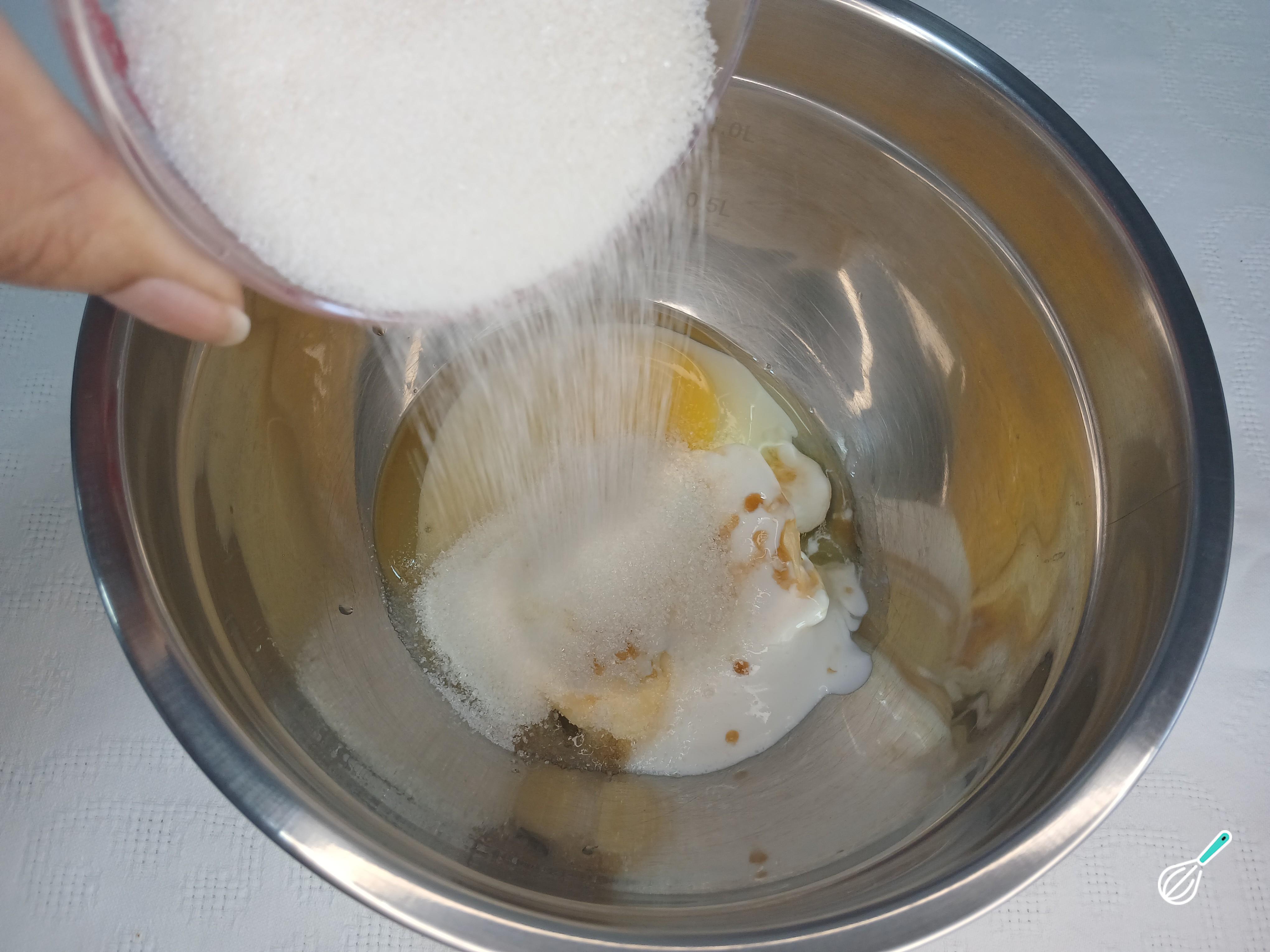 Feito isso, em um bowl coloque o ovo, a manteiga, o creme de amêndoas ou creme de leite, a essência de baunilha e o açúcar. Misture tudo muito bem até ficar bem homogênea, mexa com uma espátula de silicone.