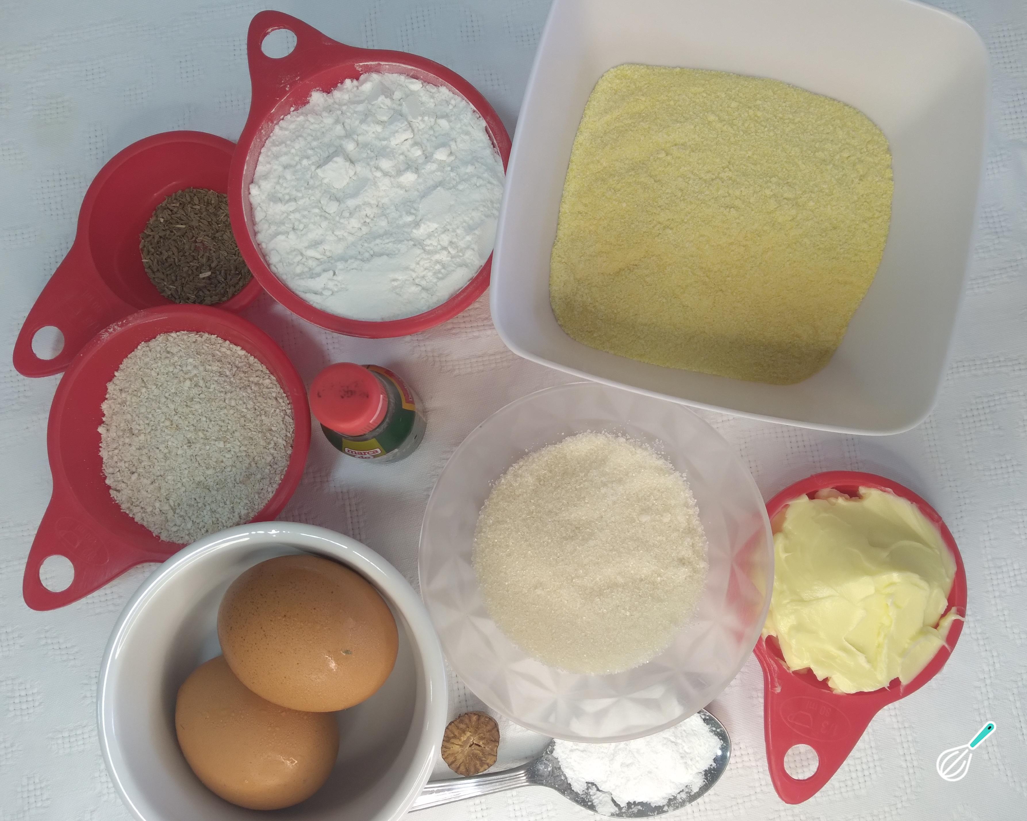 Separe os ingredientes para o preparo do biscoito de milho. Meça as farinhas a serem usadas, meça também o açúcar. Separe a erva doce, a noz moscada. O ideal é que a noz moscada seja o grão para ser ralada na hora. Separe também a margarina.