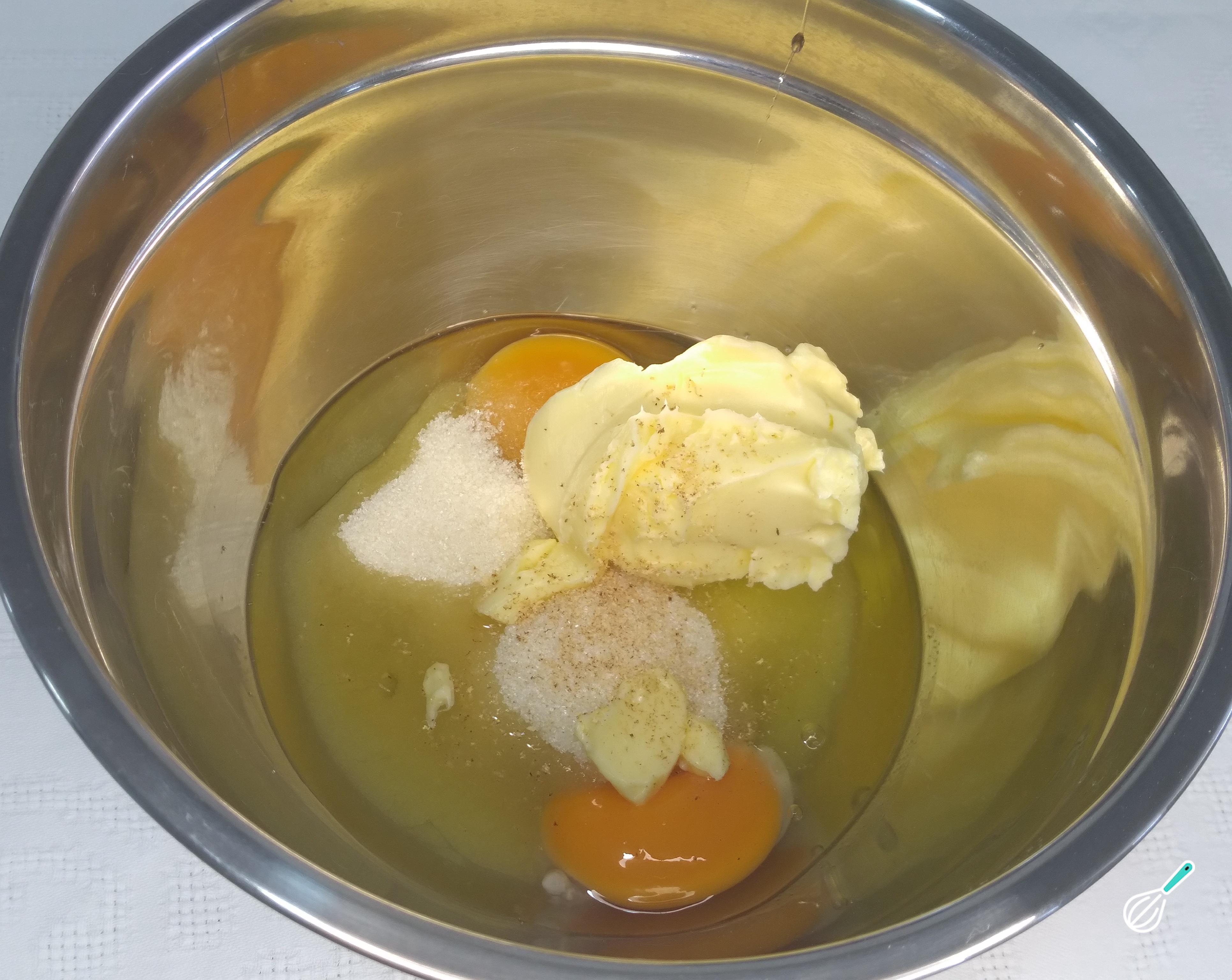 Em um bowl ou tigela, coloque os ovos, o açúcar, a margarina e a essência de baunilha.