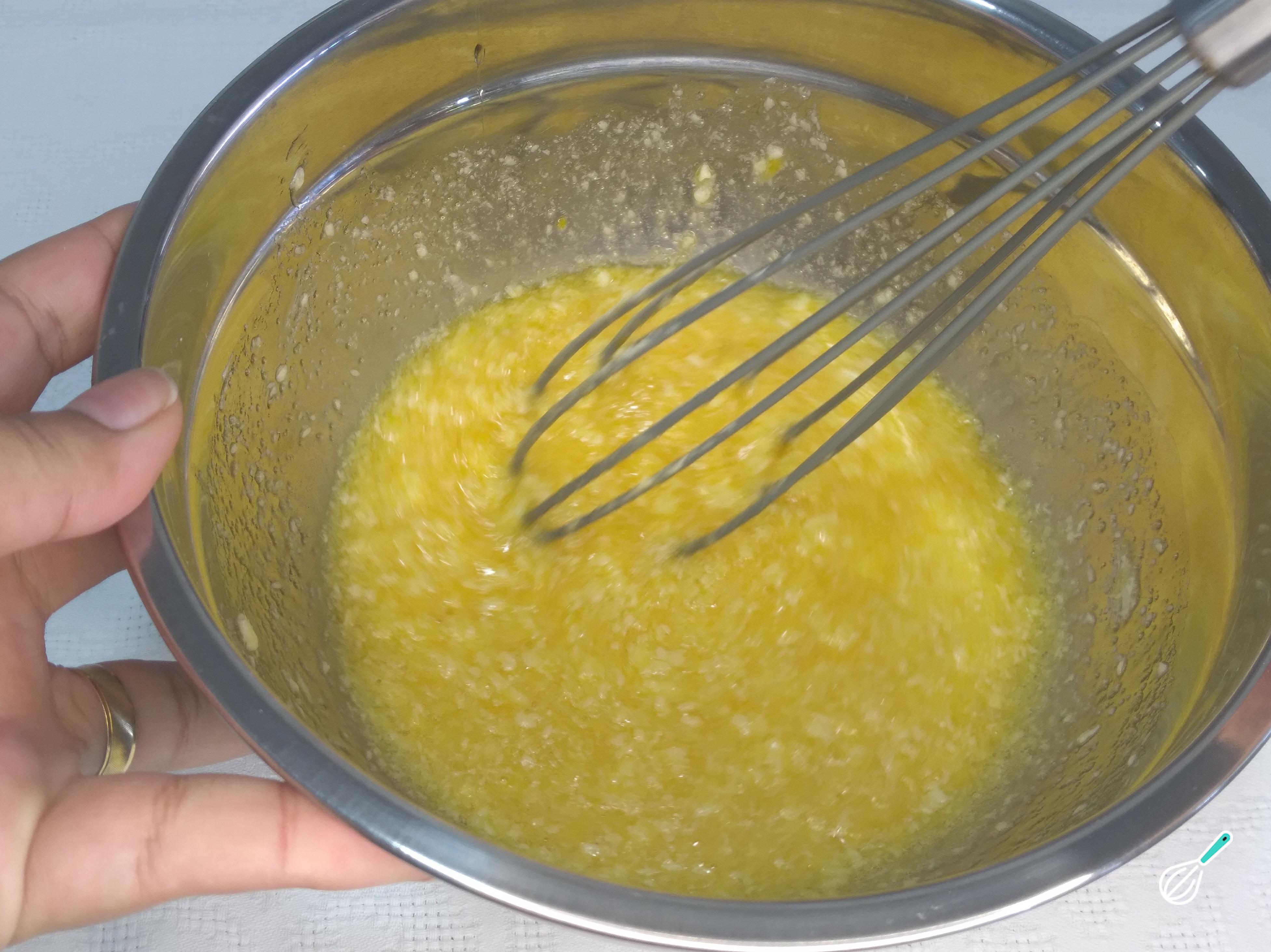 Feito isso, com o auxílio de um fouet, mexa bem os ingredientes. Dissolva a margarina para que não fique com pedaços concentrados. Deixe tudo bem homogêneo.