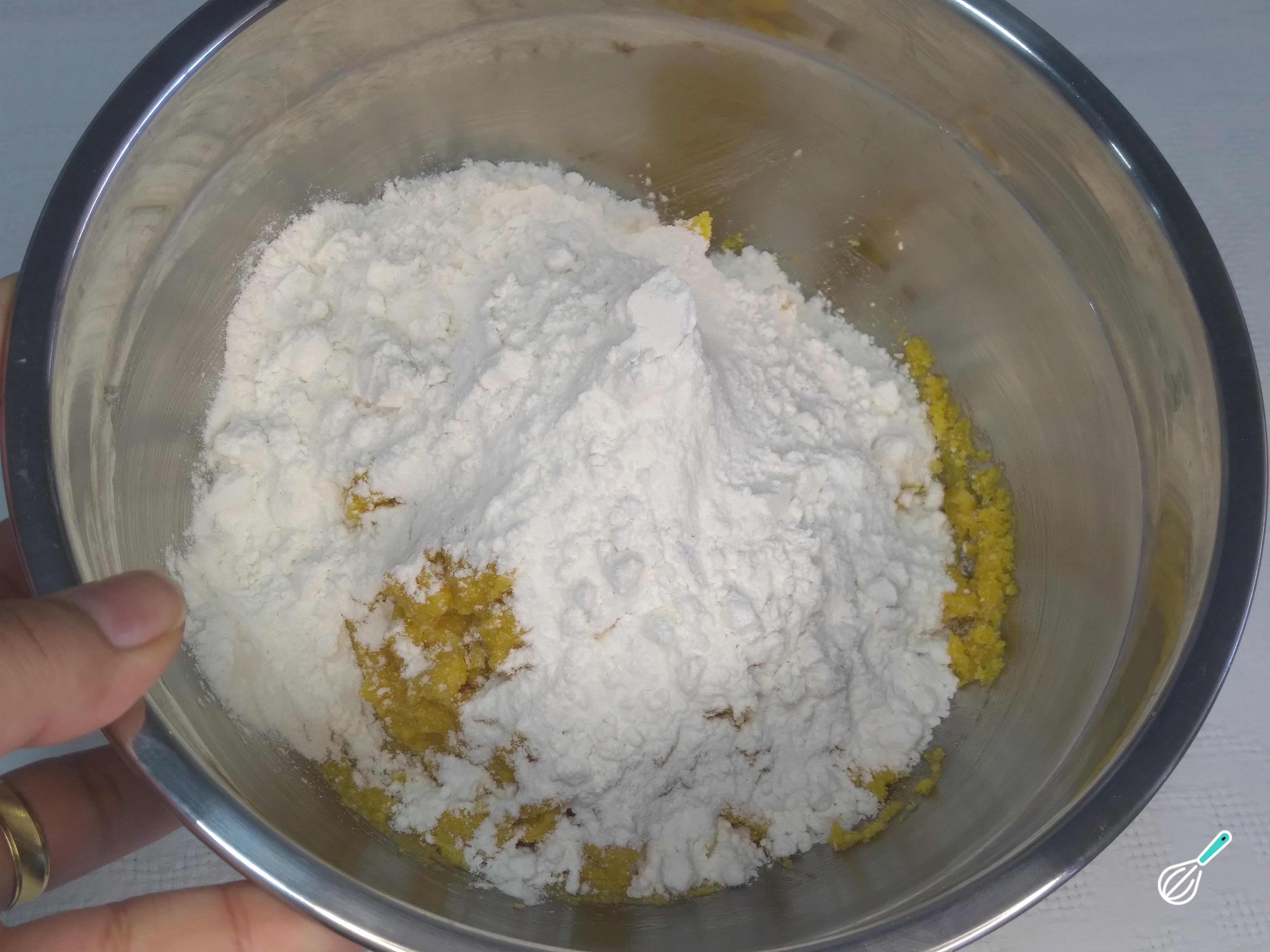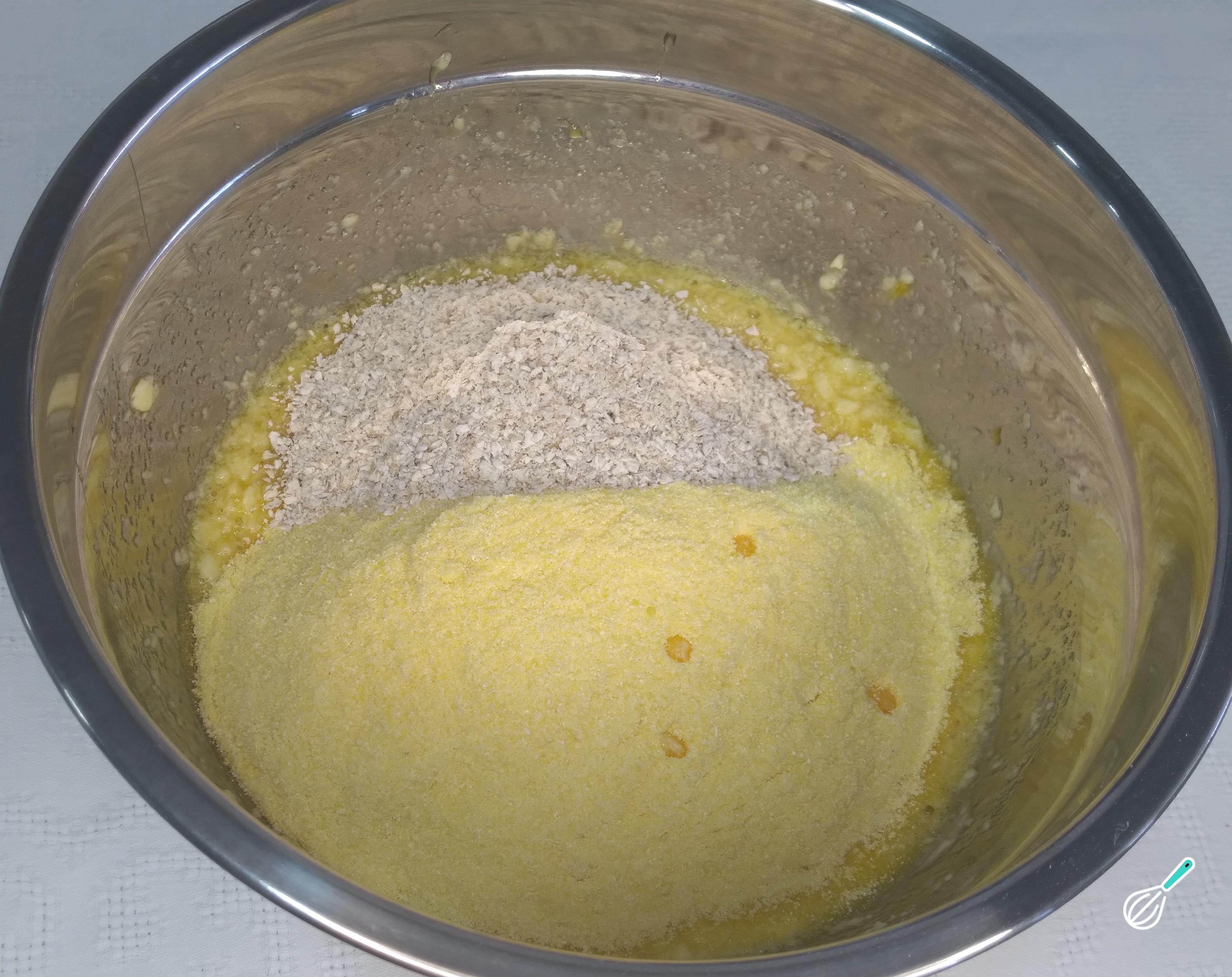 Feito isso, acrescente a farinha de arroz e a farinha de aveia. Misture tudo muito bem com as mãos para que não fique nenhum pedaço de farinha ou fubá concentrados.