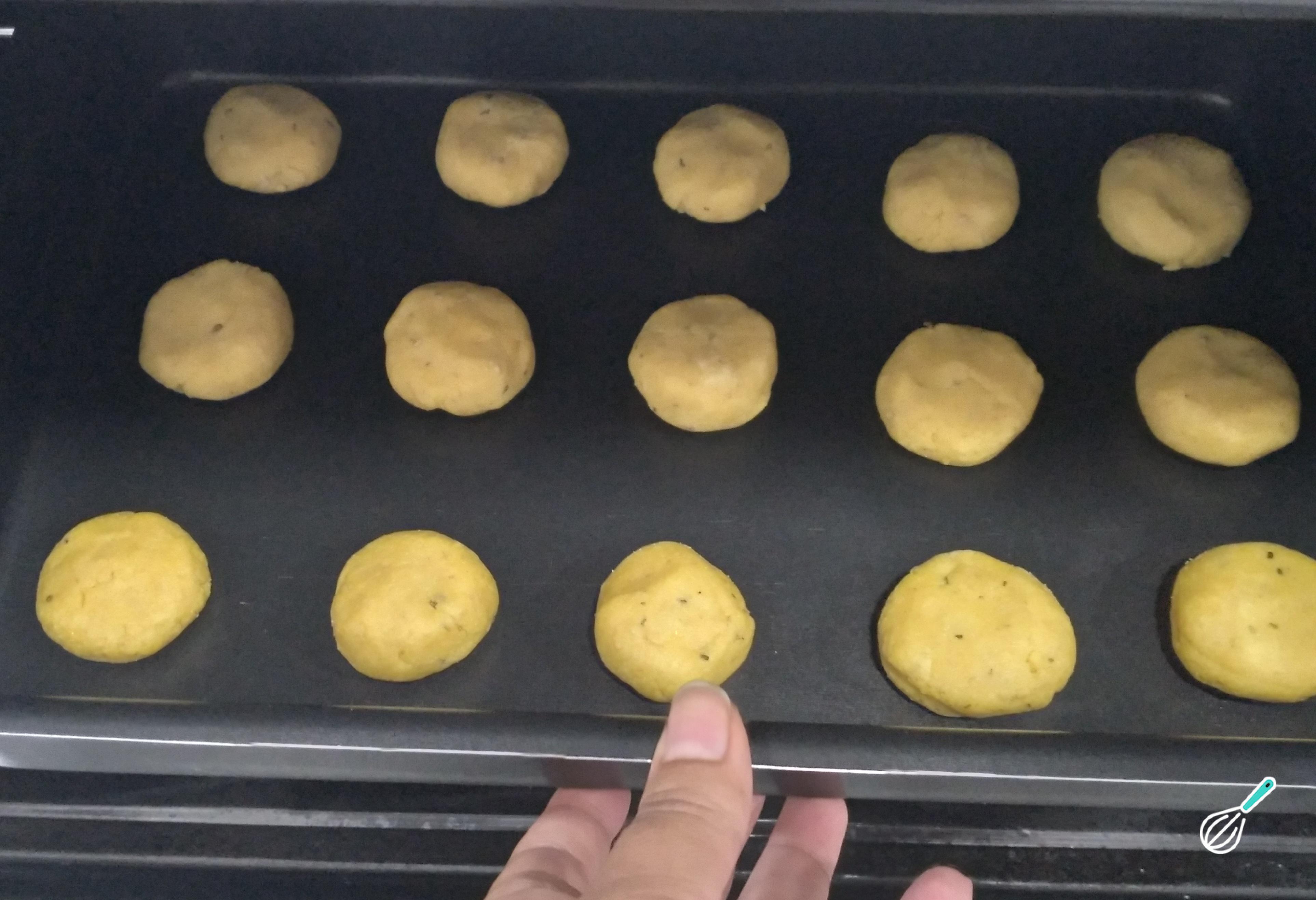 Disponha os biscoitos em uma assadeira antiaderente e pré-aqueça o forno a 200 graus. Leve para assar por aproximadamente 20 minutos. Cuidado com o forno, eles assam super rápido.