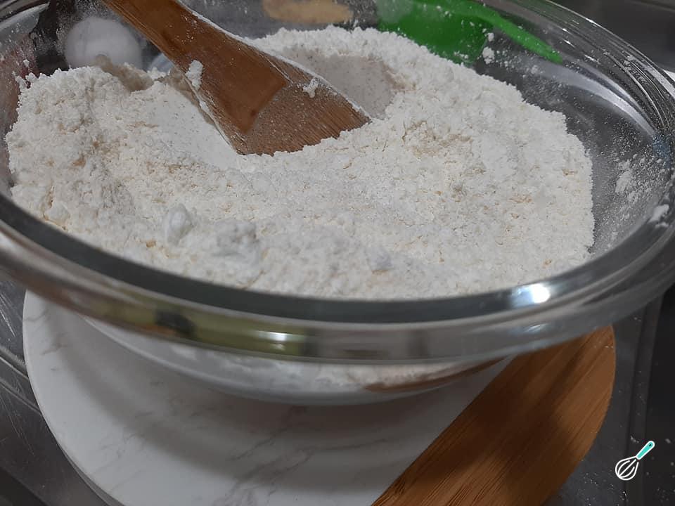 Numa tigela misture os ingredientes secos: 1 xícara (chá) e meia de farinha de trigo, 1 xícara (chá) e meia de amido de milho, o açúcar, o fermento em pó e o sal.
