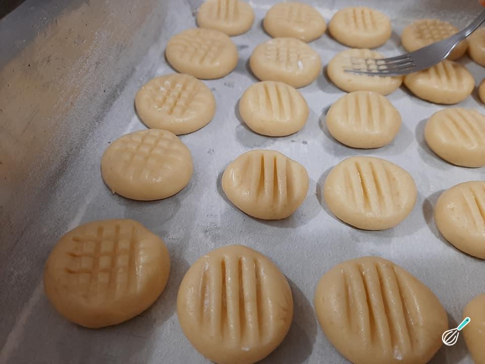 Também poderá modelar os biscoitos com a ajuda de um garfo, conforme mostra a foto. Leve-os para assar em forno pré aquecido a 180 graus por 20 a 25 minutos ou até que estejam dourados levemente nas extremidades.