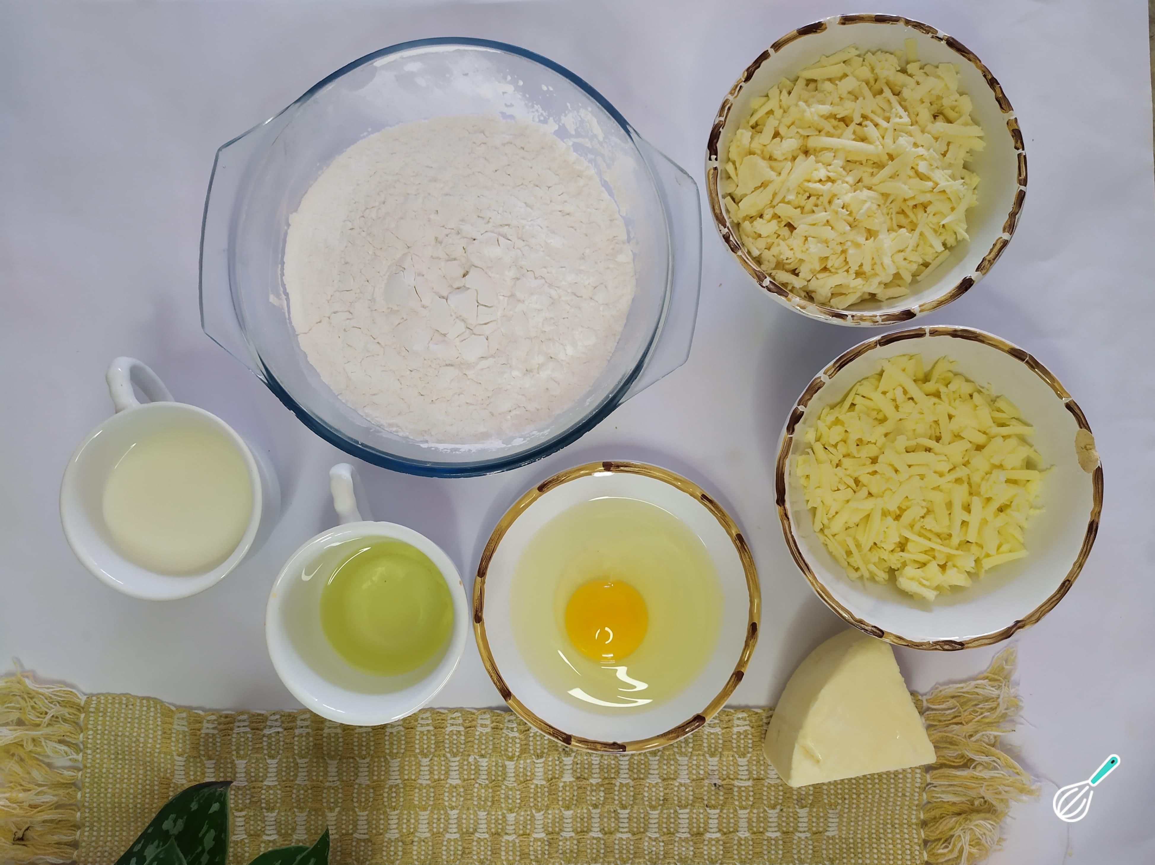 Comece separando todos os ingredientes para o preparo do Biscoito de Polvilho Frito com Queijo.