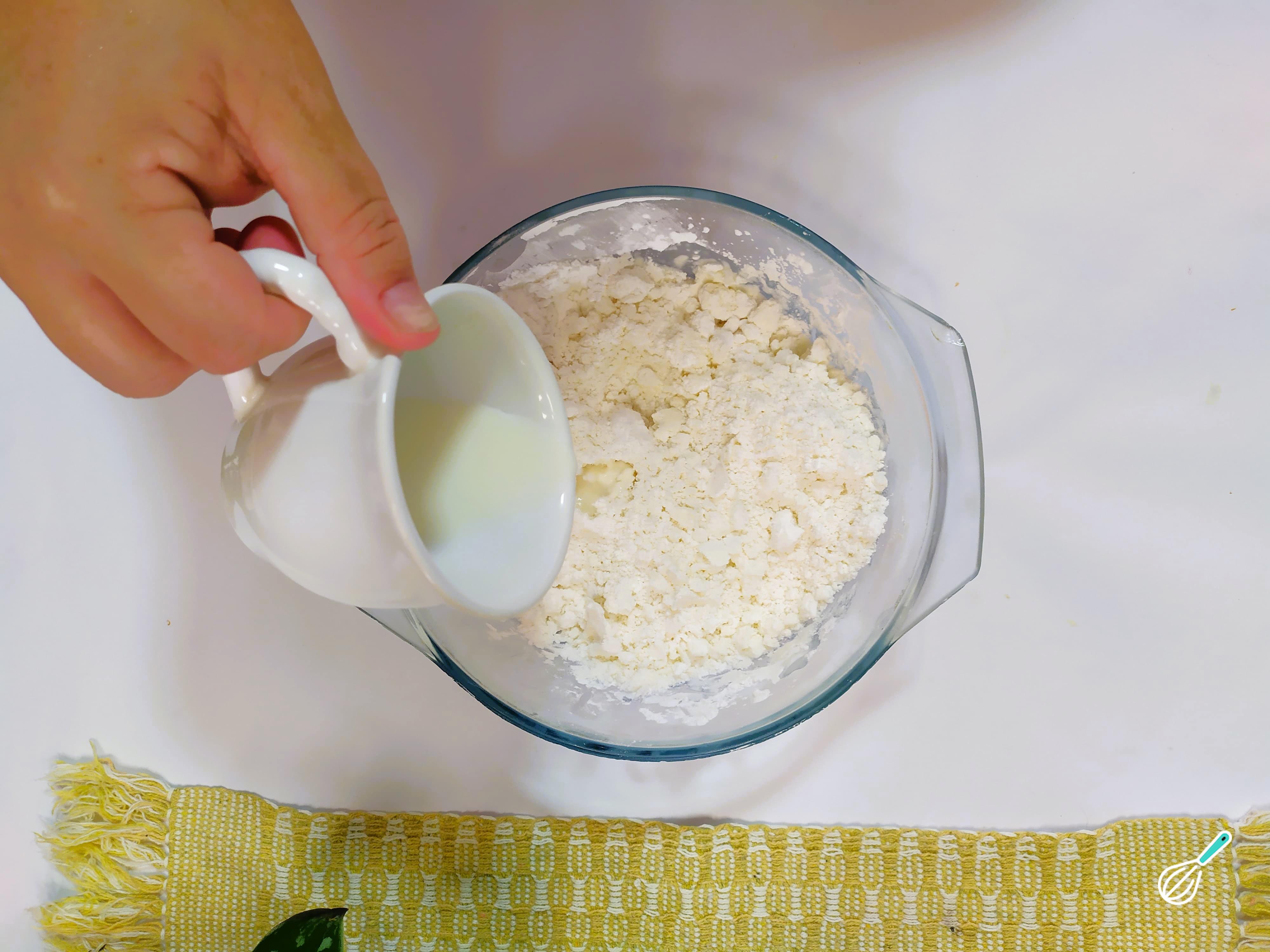 Em uma tigela grande, coloque o polvilho doce e em seguida adicione o leite frio.