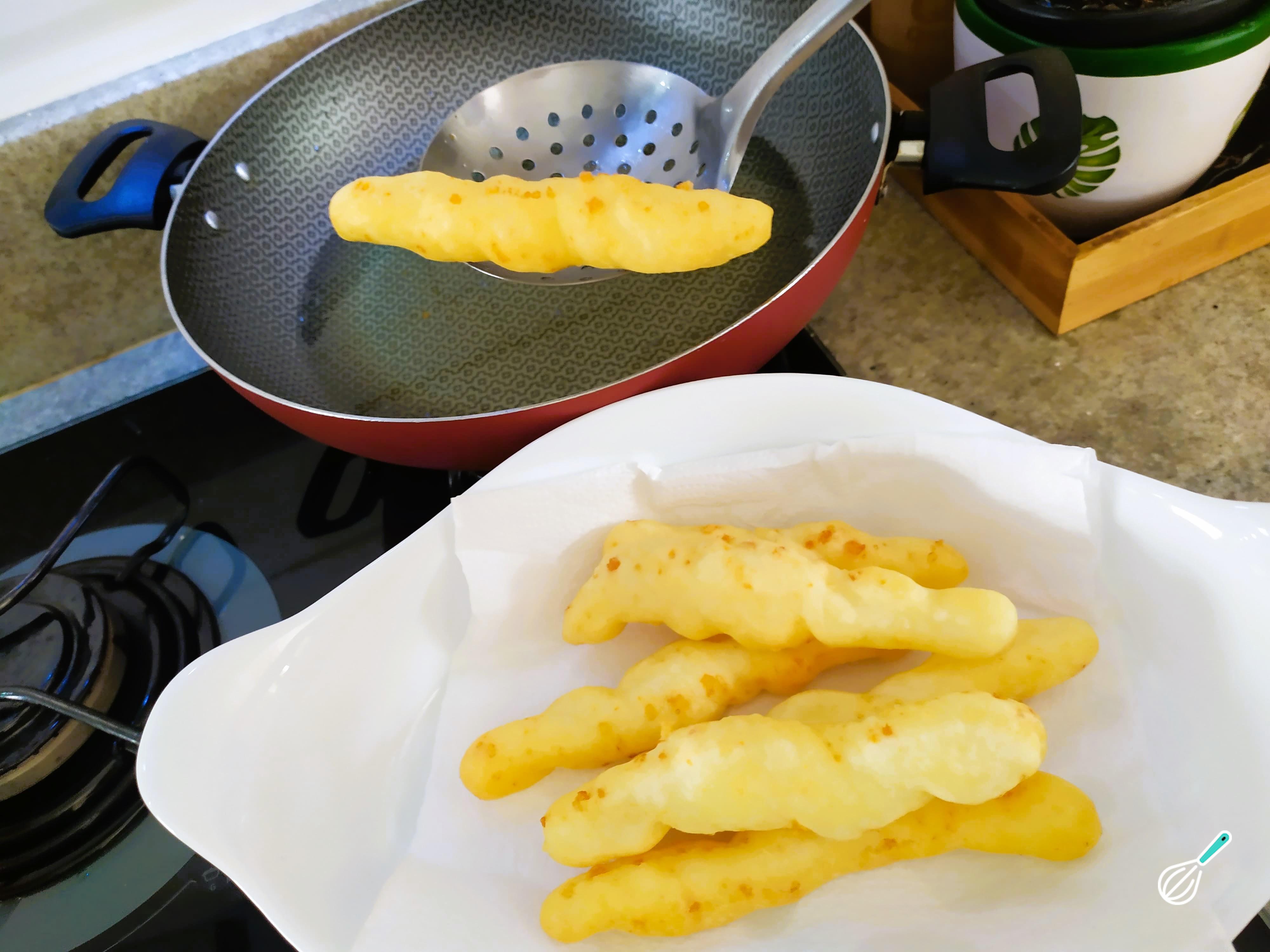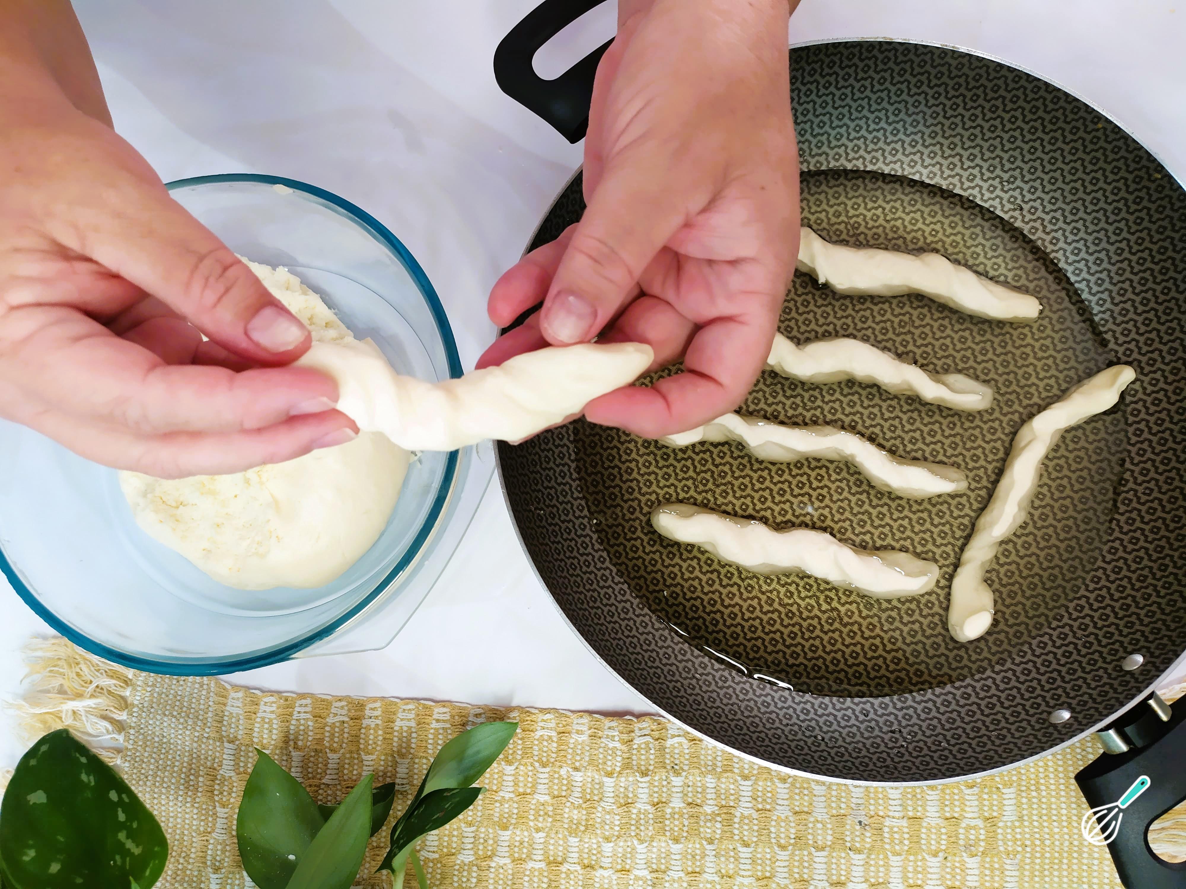 Dica: Não modele biscoitos de polvilho muito grandes, pois aumentam de tamanho quando fritam.