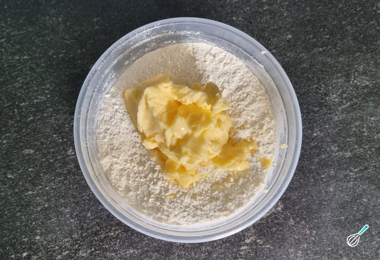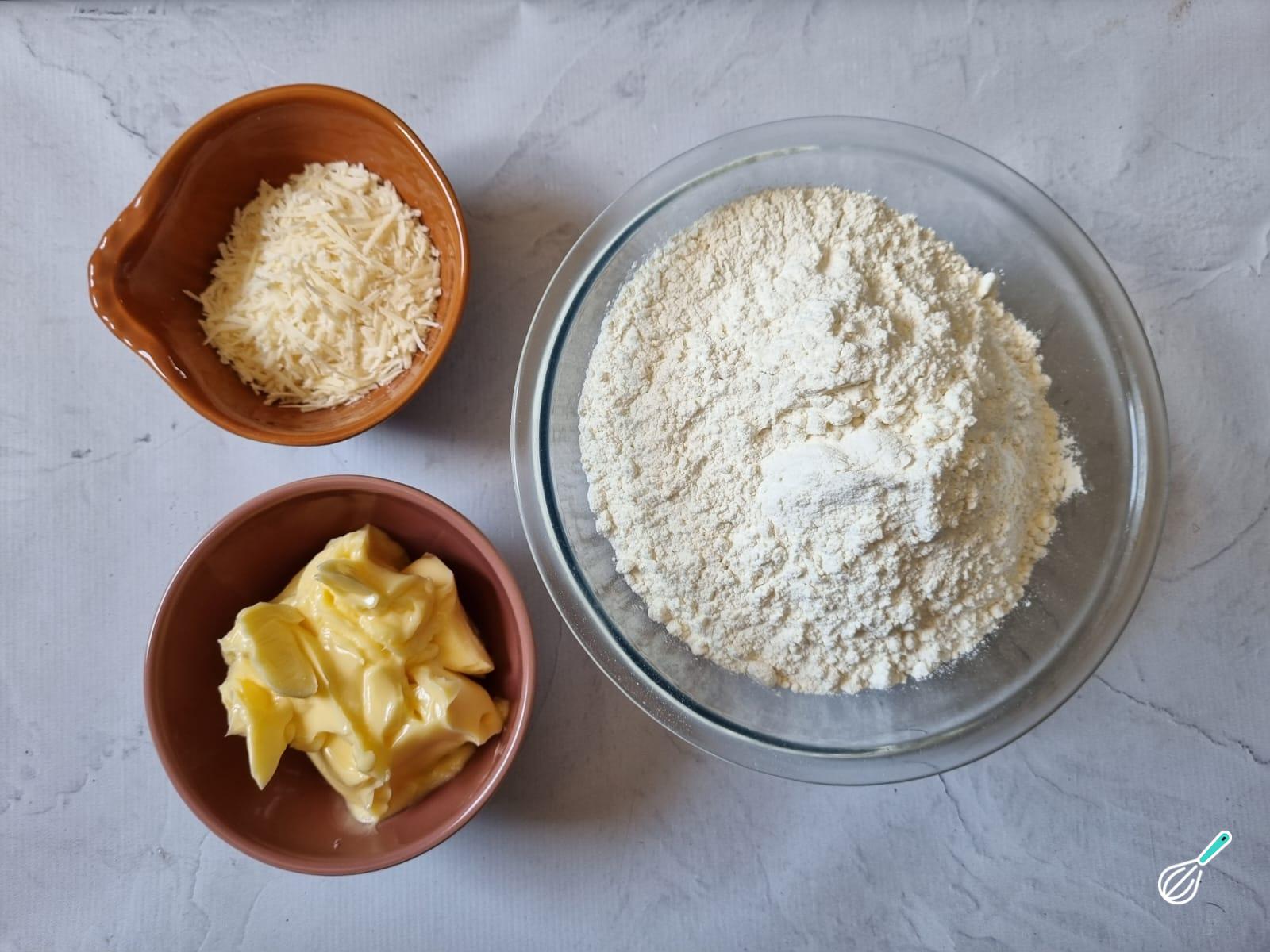 Numa tigela coloque todos os ingredientes: o queijo, a manteiga e a farinha.