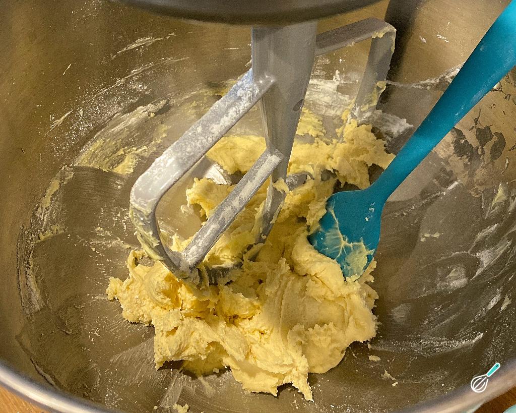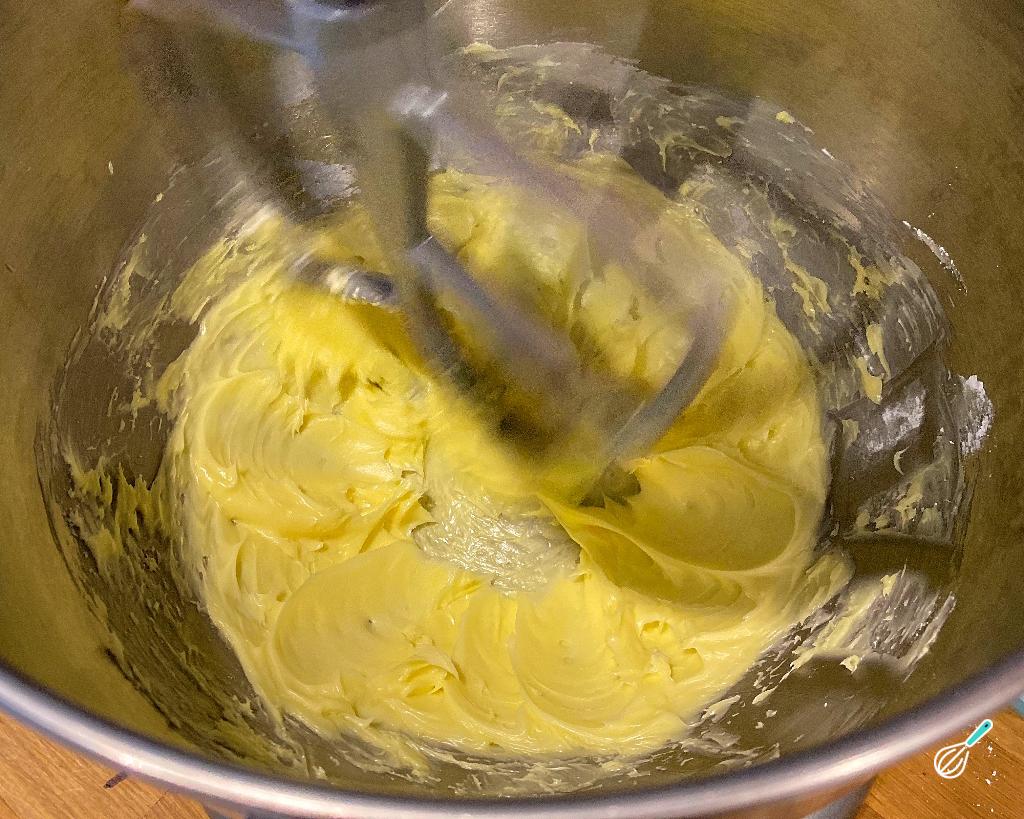 Comece seu biscoito amanteigado de Natal misturando a manteiga com o açúcar de confeiteiro até obter uma massa bem fofinha e branquinha.