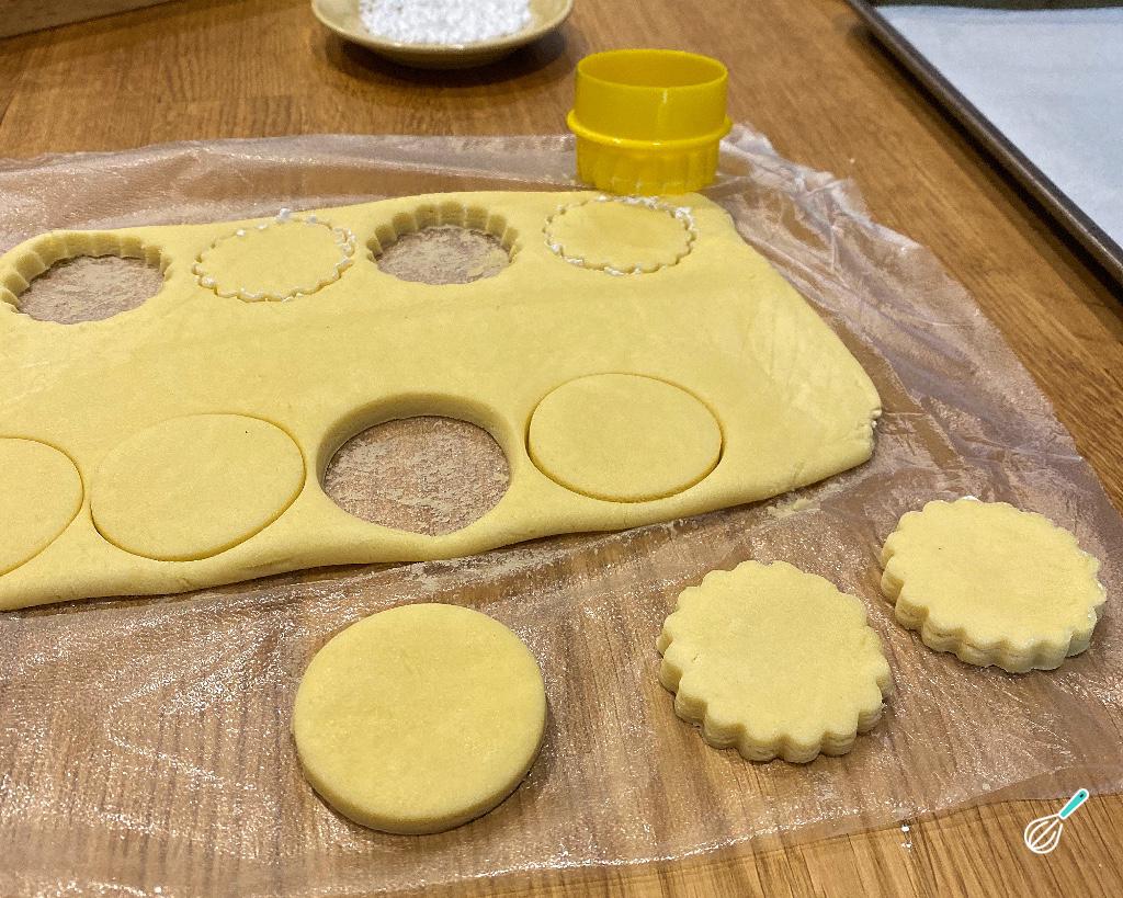 Retire a massa do freezer e, com a ajuda de um rolo de macarrão, abra a massa numa espessura de 0,5 cm. Corte então seus biscoitos no formato que preferir.