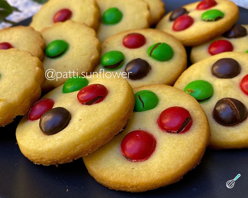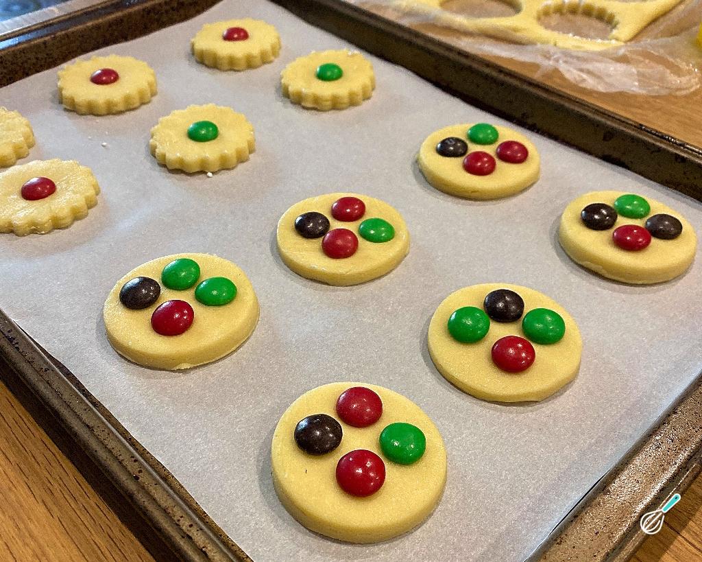 Forre uma forma com papel manteiga e disponha seus biscoitos de Natal nela. Agora vem a parte gostosa: decorar! Eu separei M&Ms vermelhos e verdes, para lembrar o Natal, e distribuí entre os discos de massa.